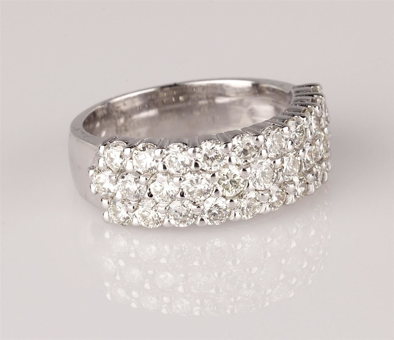 Fourteen karat (14K) white gold round brilliant cut diamond band. Round brilliant cut diamonds are prong set throughout the center of the band. The ring is cast stamped "14K" and has a gross weight of 7.02 grams. Diamond(s): Shape: Round Brilliant Cut. Weight: 2.00 carat. Average Clarity: SI2-SI3. Average Color: H. Symmetry: Very Good. Polish: Very Good. Fluorescence: None. Metal(s): Metal: Gold, Stamped. Purity: 14K. Color: White. Condition: Excellent. Finish: High polish. GGA Appraised at $11,720.00.