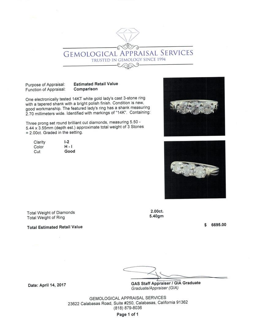 One electronically tested 14KT white gold lady's cast 3-stone ring with a tapered shank with a bright polish finish. The featured lady's ring has a shank measuring 2.70 millimeters wide. Identified with markings of '14K'. Condition is new, good workmanship. Containing: Three prong set round brilliant cut diamonds, measuring 5.50 - 5.44 x 3.55mm (depth est.) approximate total weight of 3 Stones = 2.00ct. Graded in the setting. Color H - I Clarity I-2 Cut Good. Total Weight of Diamonds 2.00ct.. Total Weight of Ring 5.40gm GAS Appraised at $6695.00. GAS Appraised at $6,695.00.