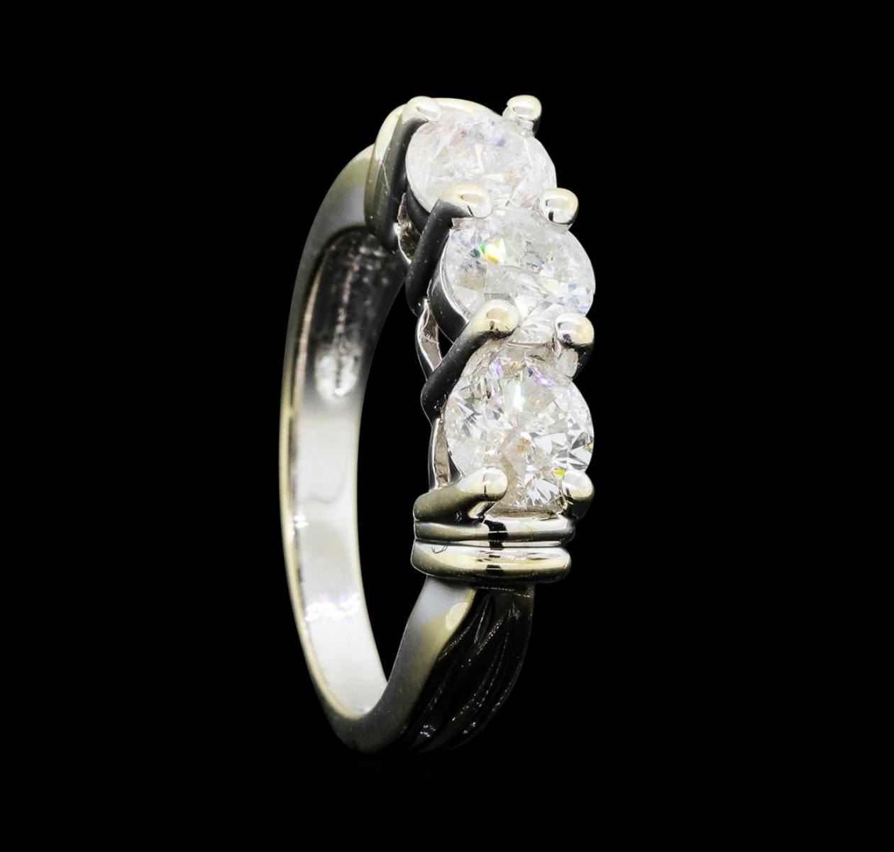 One electronically tested 14KT white gold lady's cast 3-stone ring with a tapered shank with a bright polish finish. The featured lady's ring has a shank measuring 2.70 millimeters wide. Identified with markings of '14K'. Condition is new, good workmanship. Containing: Three prong set round brilliant cut diamonds, measuring 5.50 - 5.44 x 3.55mm (depth est.) approximate total weight of 3 Stones = 2.00ct. Graded in the setting. Color H - I Clarity I-2 Cut Good. Total Weight of Diamonds 2.00ct.. Total Weight of Ring 5.40gm GAS Appraised at $6695.00. GAS Appraised.