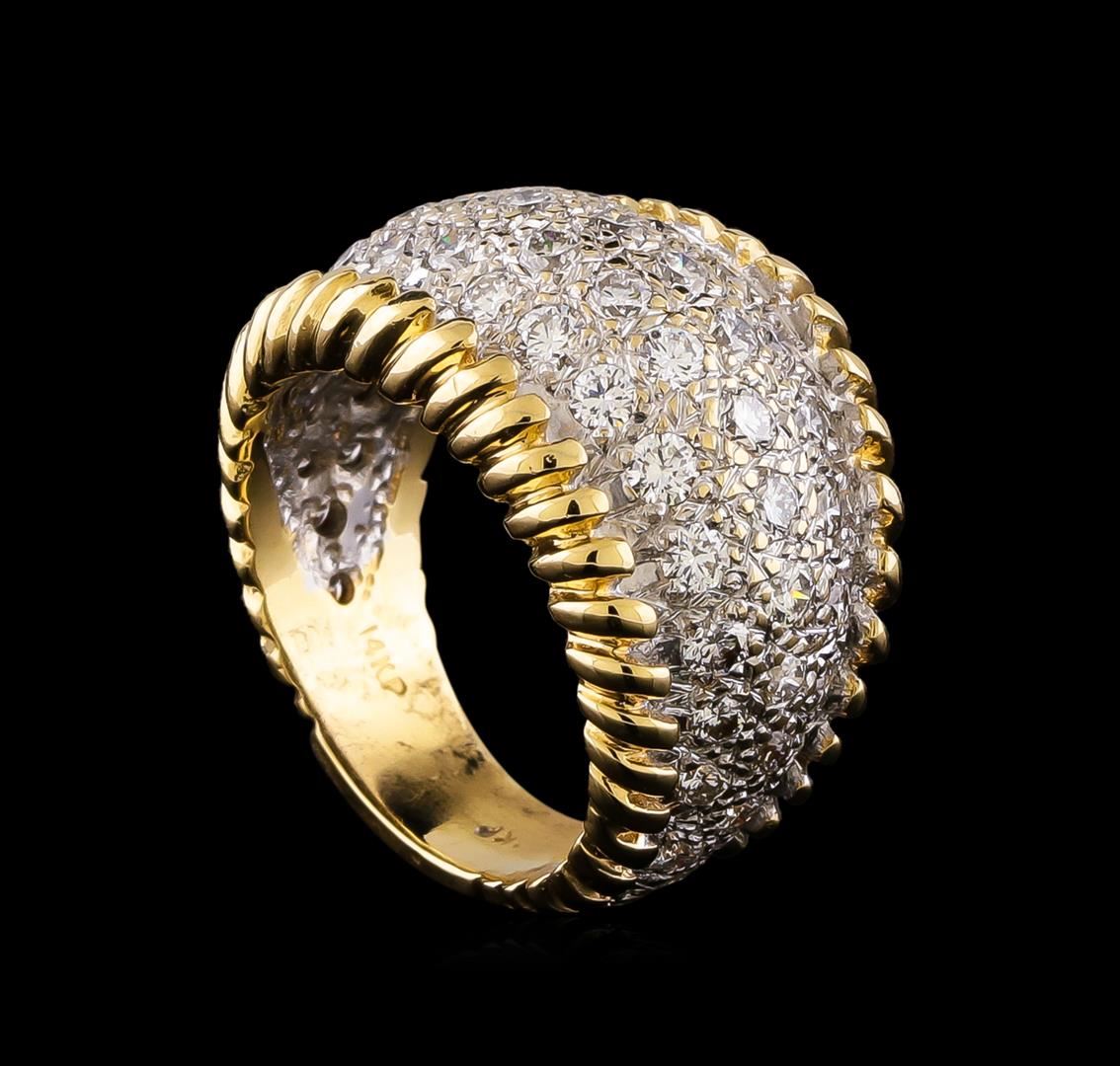One electronically tested 14KT yellow gold ladies cast diamond cluster ring. The ring features a diamond set curvature set within parallel yellow gold ribbons supported by tapering shoulders, completed by a six millimeter wide band. Bright and patterned finish with rhodium accents. Identified with markings of "14KP". Condition is good. Containing: Fifty-Three pave' set round brilliant cut diamonds, measuring 2.50 - 2.00 x 1.35mm (depth est.) approximate total weight of 53 Stones = 2.00ct. Graded in the setting. Clarity: VS-1 to SI-1. Color: G - H. Total Weight of Diamonds 2.00ct. Total Weight of Ring 12.58gm. AIG Appraised at $9,265.00.