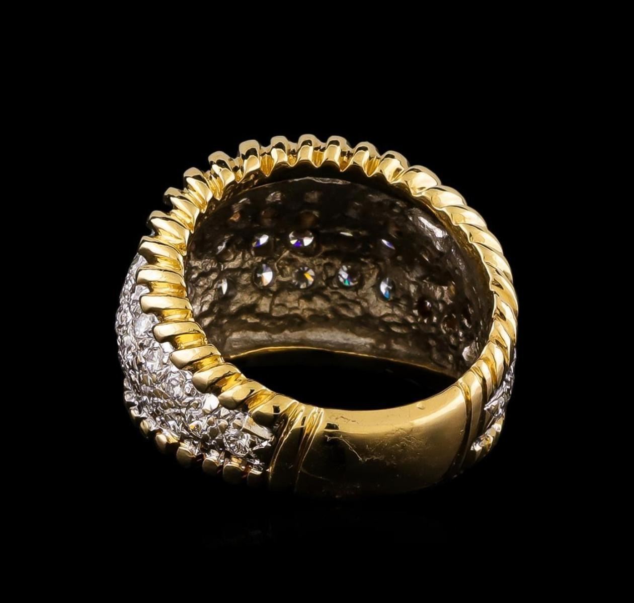 One electronically tested 14KT yellow gold ladies cast diamond cluster ring. The ring features a diamond set curvature set within parallel yellow gold ribbons supported by tapering shoulders, completed by a six millimeter wide band. Bright and patterned finish with rhodium accents. Identified with markings of "14KP". Condition is good. Containing: Fifty-Three pave' set round brilliant cut diamonds, measuring 2.50 - 2.00 x 1.35mm (depth est.) approximate total weight of 53 Stones = 2.00ct. Graded in the setting. Clarity: VS-1 to SI-1. Color: G - H. Total Weight of Diamonds 2.00ct. Total Weight of Ring 12.58gm. AIG Appraised.