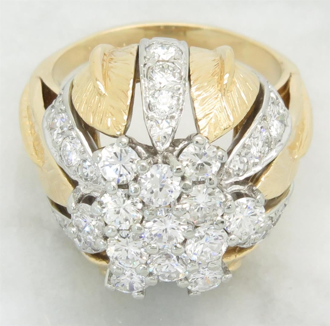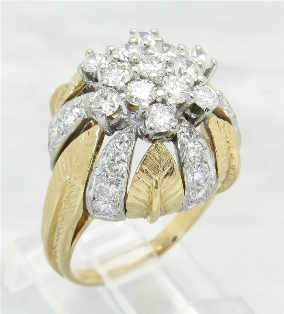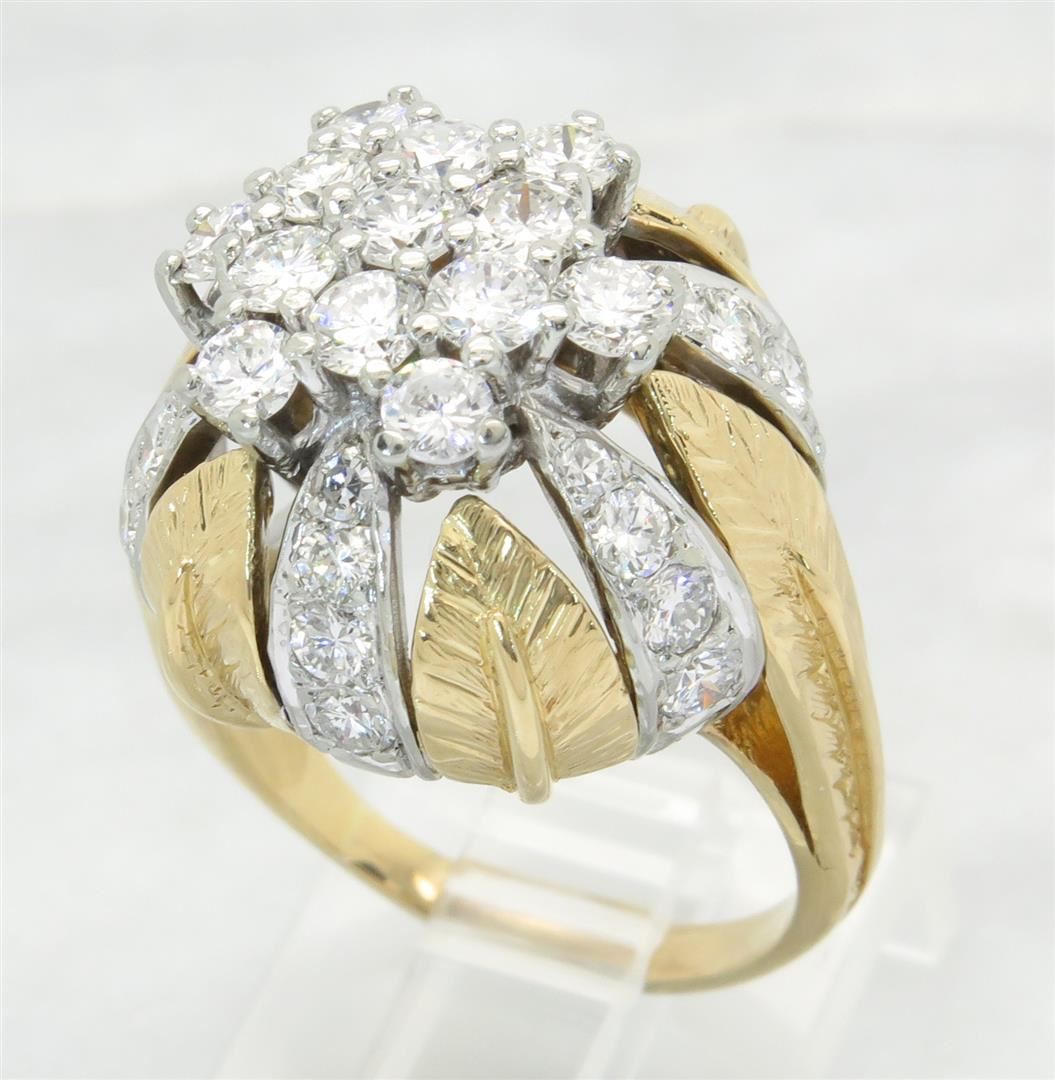 One tested 14K gold diamond ring. Containing: 31 Round Brilliant Cut Diamonds, 6 Single Cut Diamonds. Clarity: SI1-I1, Color: G-I. Approximate total diamond weight: 2.00CTW. All diamonds are graded in the mounting unless otherwise stated. Weight of ring: 10.9 grams, Size: 5.75.