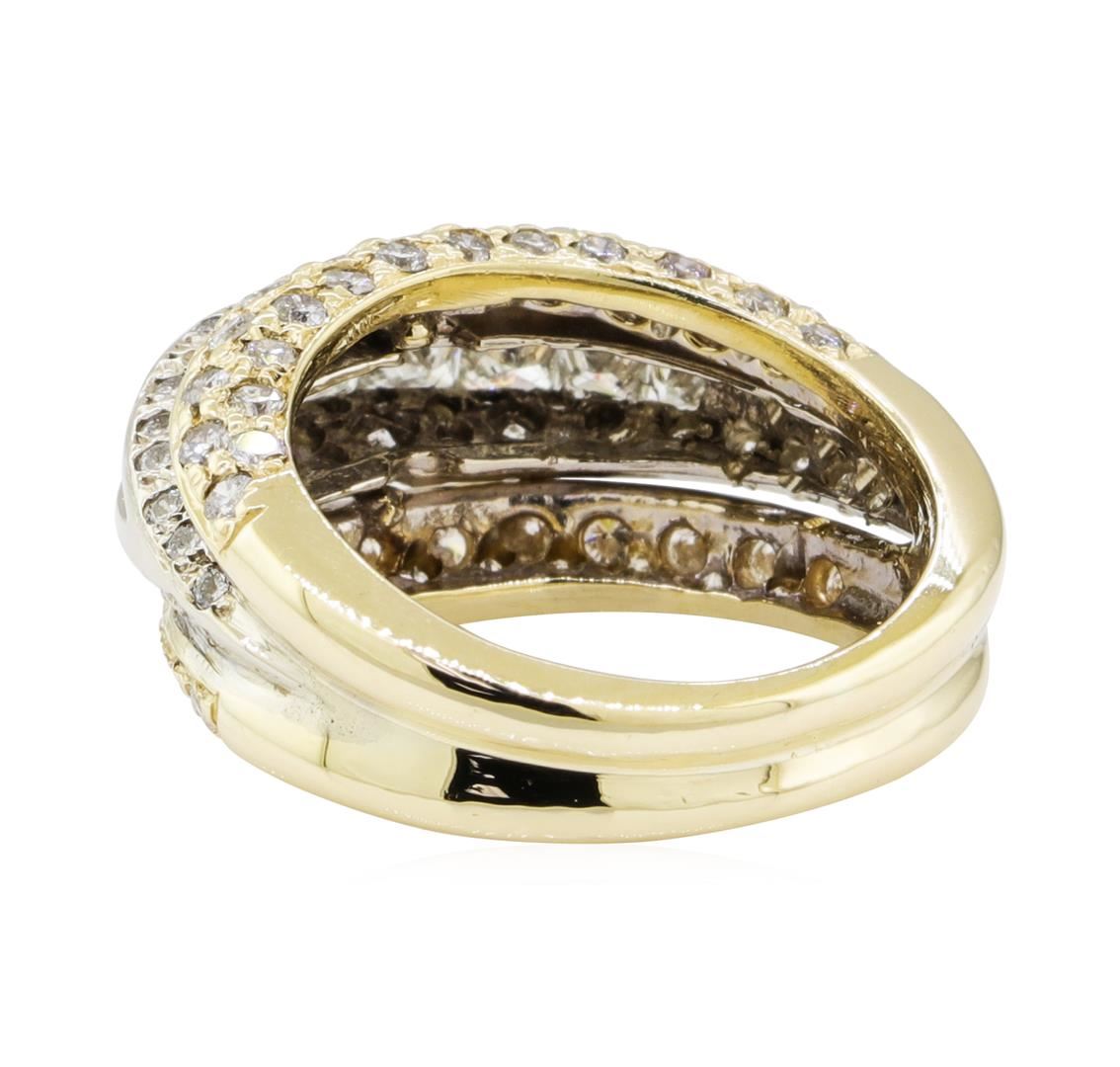 One electronically tested 14KT yellow and white gold lady's combination cast & assembled fashion ring with a domed three section band with a bright polish finish. The featured lady's ring has a double shank measuring 4.30 millimeters wide. Identified with markings of '14K'. Condition is used, good workmanship. Containing: Eight channel set princess cut diamonds, measuring 2.90 x 2.00 x 1.50mm (depth est.) approximate total weight of 8 Stones = 0.60ct. Graded in the setting. Color H - I Clarity VS-2 to SI-1 Cut Very Good Ninety-Seven bead set round brilliant cut diamonds, measuring 1.80 - 1.30 x 0.96mm (depth est.) approximate total weight of 97 Stones = 1.40ct. Graded in the setting. Color H - I Clarity VS-2 to SI-2 Cut Good. Total Weight of Diamonds 2.00ct.. Total Weight of Ring 7.70gm GAS Appraised at $3260.00. GAS Appraised at $3,260.00.