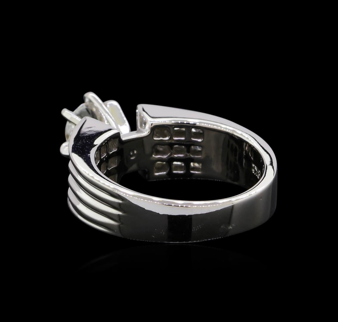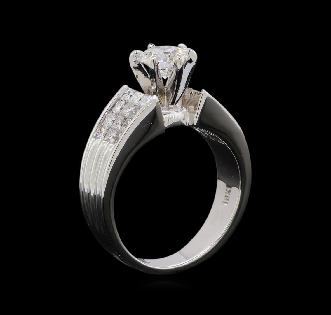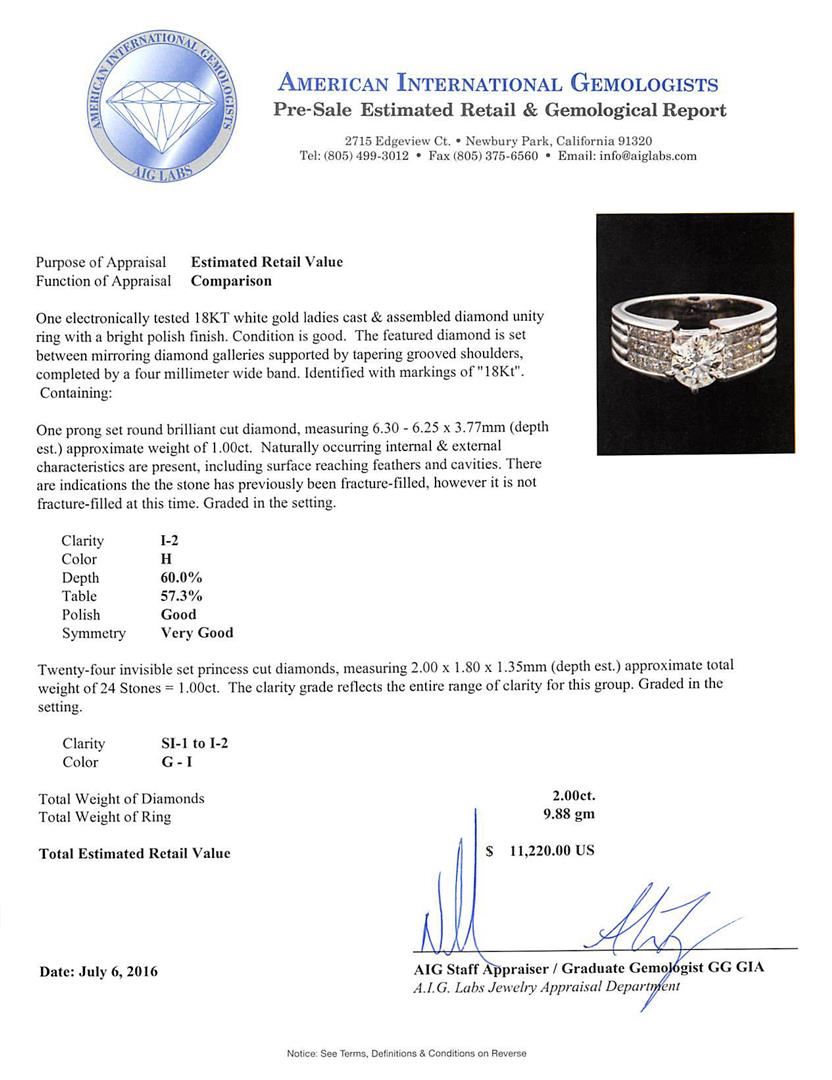 One electronically tested 18KT white gold ladies cast & assembled diamond unity ring with a bright polish finish. The featured diamond is set between mirroring diamond galleries supported by tapering grooved shoulders, completed by a four millimeter wide band. Identified with markings of "18Kt". Condition is good. Containing: One prong set round brilliant cut diamond, measuring 6.30 - 6.25 x 3.77mm (depth est.) approximate weight of 1.00ct. Naturally occurring internal & external characteristics are present, including surface reaching feathers and cavities. There are indications the the stone has previously been fracture-filled, however it is not fracture-filled at this time. Graded in the setting. Clarity: I-2. Color: H. Depth 60.0%. Table 57.3%. Twenty-Four invisible set princess cut diamonds, measuring 2.00 x 1.80 x 1.35mm (depth est.) approximate total weight of 24 Stones = 1.00ct. The clarity grade reflects the entire range of clarity for this group. Graded in the setting. Clarity: SI-1 to I-2. Color: G - I. Total Weight of Diamonds 2.00ct. Total Weight of Ring 9.88gm. AIG Appraised at $11,220.00.