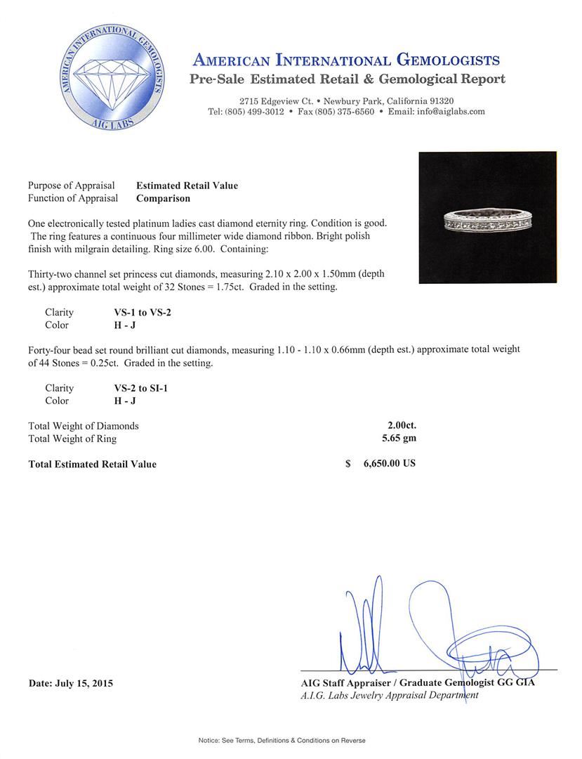One electronically tested platinum ladies cast diamond eternity ring. The ring features a continuous four millimeter wide diamond ribbon. Bright polish finish with milgrain detailing. Ring size 6.00. Condition is good. Containing: Thirty-Two channel set princess cut diamonds, measuring 2.10 x 2.00 x 1.50mm (depth est.) approximate total weight of 32 Stones = 1.75ct. Graded in the setting. Clarity: VS-1 to VS-2. Color: H - J Forty-Four bead set round brilliant cut diamonds, measuring 1.10 - 1.10 x 0.66mm (depth est.) approximate total weight of 44 Stones = 0.25ct. Graded in the setting. Clarity: VS-2 to SI-1. Color: H - J. Total Weight of Diamonds 2.00ct. Total Weight of Ring 5.65gm. AIG Appraised at $6,650.00.
