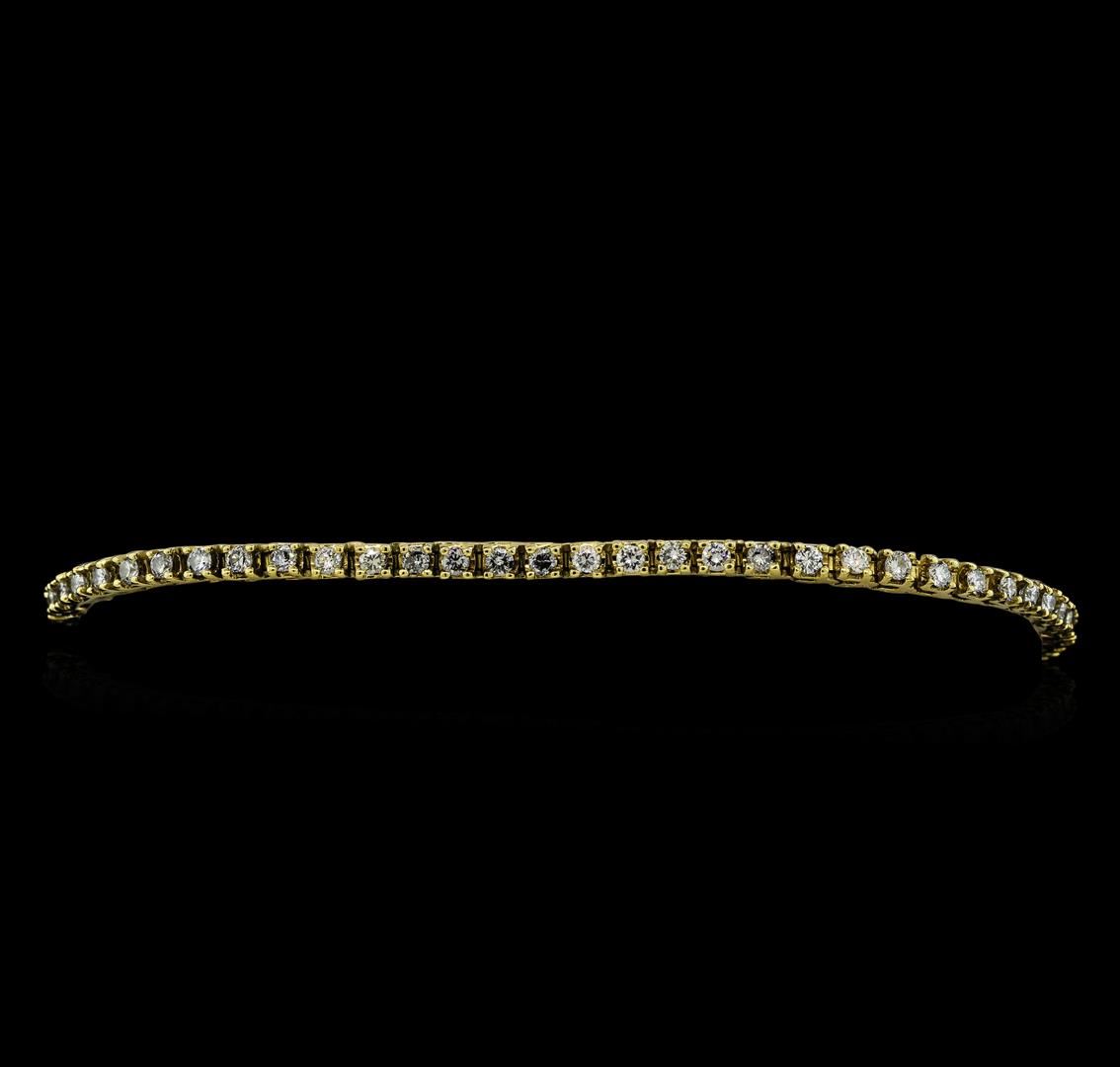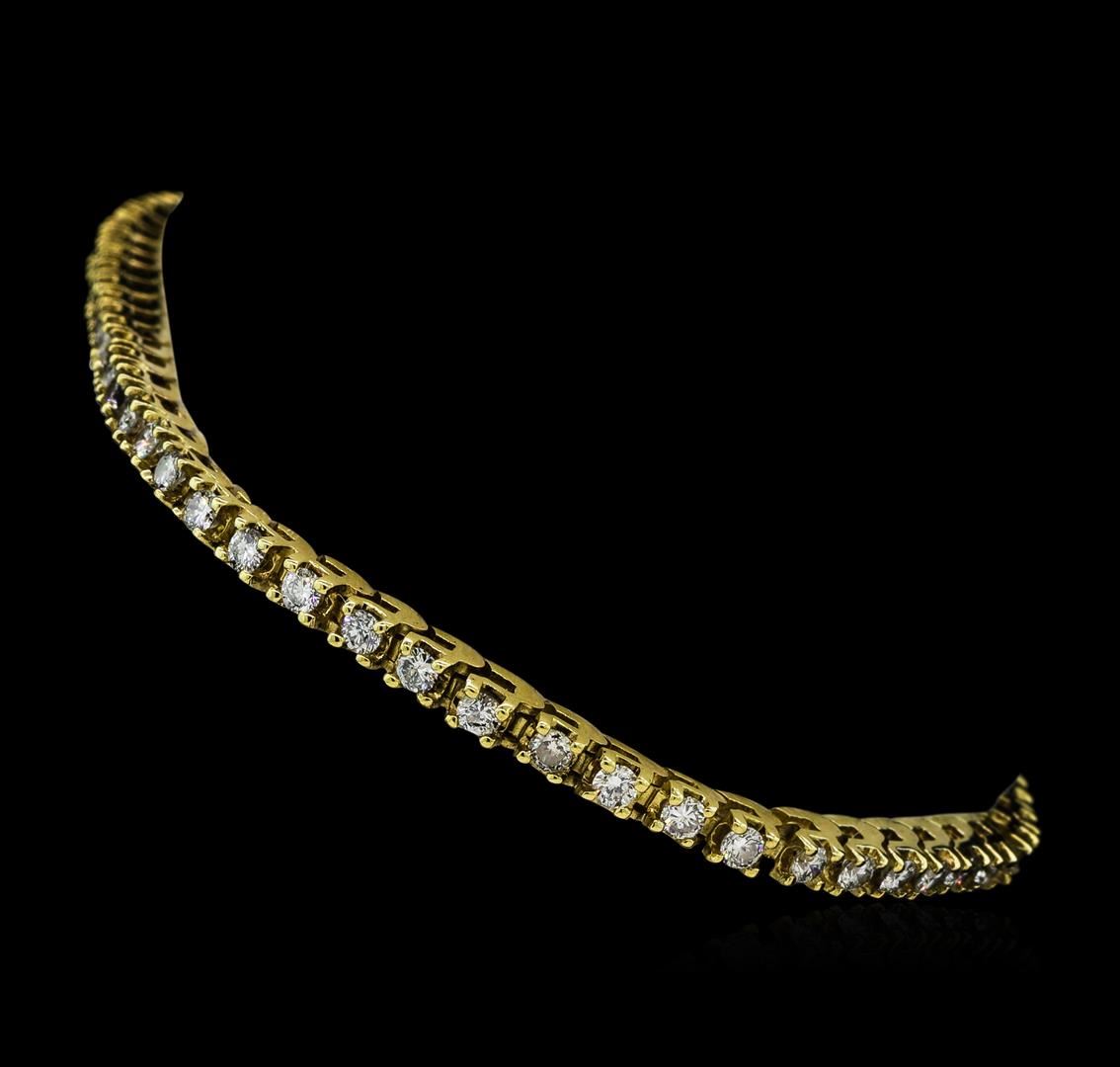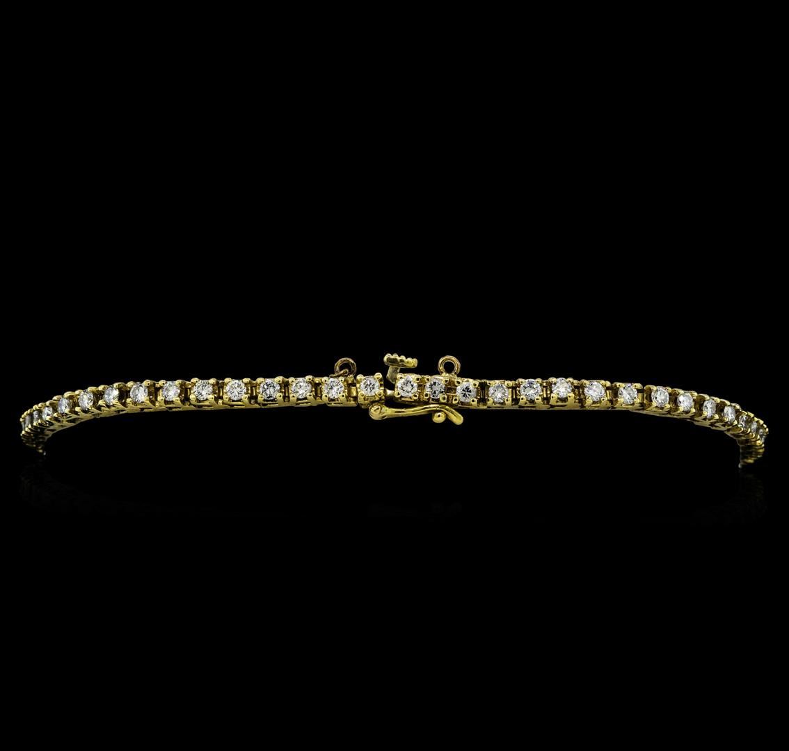 One electronically tested 14KT yellow gold ladies cast & assembled diamond tennis bracelet. Seven and three-quarter inch length bracelet composed of a flexible ribbon of diamonds, terminating in a concealed clasp with safety. Identified with markings of '14K'. Condition is good. Bright polish finish. Tennis bracelets & necklaces got their unusual name from an incident involving the U.S. professional tennis player Chris Evert during a tennis match in the 1980's. Evert had been wearing an expensive diamond bracelet, an inline string of individually-set diamonds. Previously these bracelets were known as eternity bracelets. When the clasp snapped during play, she asked the officials to stop the tennis match until the bracelet could be found. Since that day, bracelets and necklaces featuring an inline string of diamonds have been called tennis bracelets and tennis necklaces. Containing: Sixty-One prong set round brilliant cut diamonds, measuring 2.10 - 2.00 x 1.23mm (depth est.) approximate total weight of 61 Stones = 2.00ct. Graded in the setting. Clarity VS-2 to SI-2. Color: E - G. Total Weight of Diamonds 2.00ct.. Total Weight of Bracelet 9.00gm. AIG Appraised at $8,775.00.