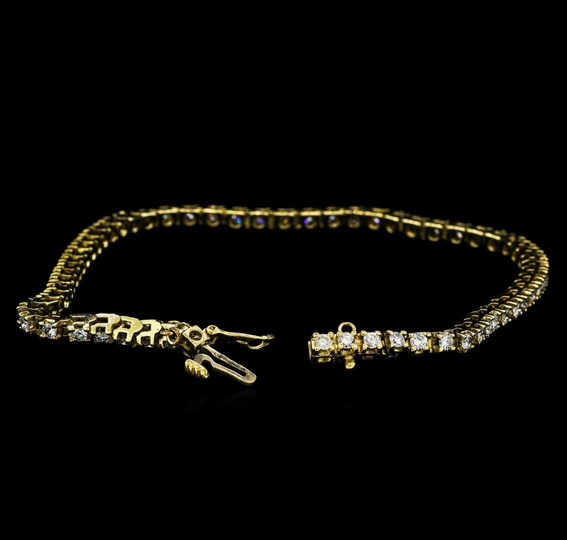 One electronically tested 14KT yellow gold ladies cast & assembled diamond tennis bracelet. Seven and three-quarter inch length bracelet composed of a flexible ribbon of diamonds, terminating in a concealed clasp with safety. Identified with markings of '14K'. Condition is good. Bright polish finish. Tennis bracelets & necklaces got their unusual name from an incident involving the U.S. professional tennis player Chris Evert during a tennis match in the 1980's. Evert had been wearing an expensive diamond bracelet, an inline string of individually-set diamonds. Previously these bracelets were known as eternity bracelets. When the clasp snapped during play, she asked the officials to stop the tennis match until the bracelet could be found. Since that day, bracelets and necklaces featuring an inline string of diamonds have been called tennis bracelets and tennis necklaces. Containing: Sixty-One prong set round brilliant cut diamonds, measuring 2.10 - 2.00 x 1.23mm (depth est.) approximate total weight of 61 Stones = 2.00ct. Graded in the setting. Clarity VS-2 to SI-2. Color: E - G. Total Weight of Diamonds 2.00ct.. Total Weight of Bracelet 9.00gm. AIG Appraised at $8,775.00.