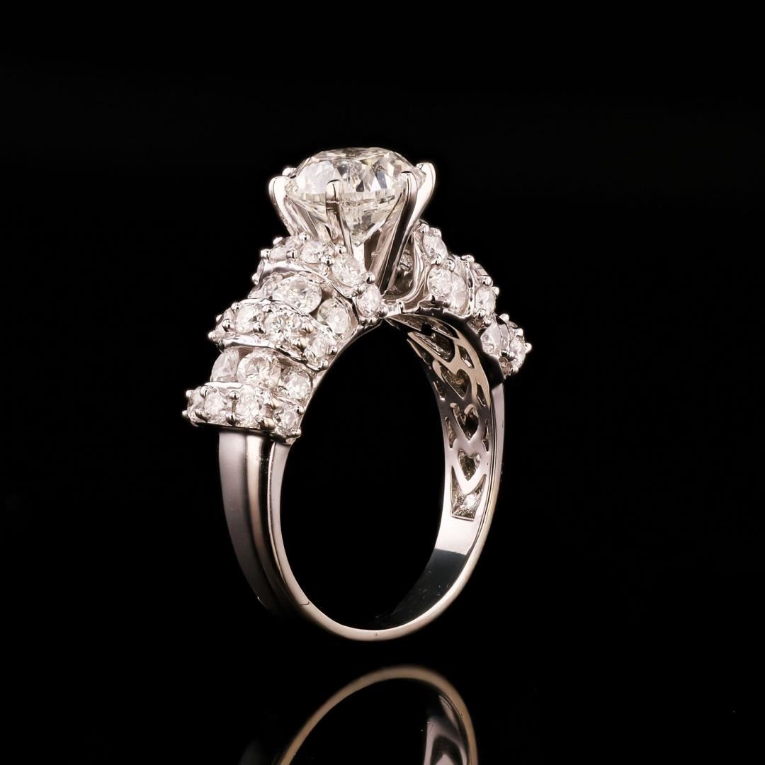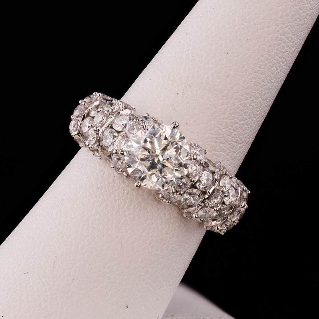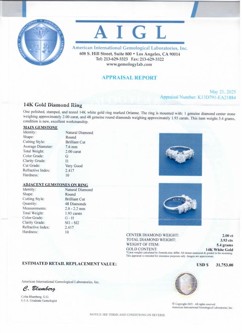 One polished, stamped, and tested 14K white gold ring marked Orianne. The ring is mounted with: 1 genuine diamond center stone weighing approximately 2.00 carat, and 48 genuine round diamonds weighing approximately 1.93 carats. This item weighs 5.4 grams, condition is new, excellent workmanship. #MAIN GEMSTONE# Identity: Natural Diamond Shape: Round Cutting Style: Brilliant Cut Average Diameter: 7.6mm Total Weight: 2.00 carat Color Grade: G Clarity Grade: I1 Cut Grade: Very Good Refractive Index: 2.417 Hardness: 10 #ADJACENT GEMSTONES ON RING# Identity: Natural Diamond Shape: Round Cutting Style: Brilliant Cut Quantity: 48 Diamonds Measurements: 2.0 - 2.2mm Total Weight: 1.93 carats Color Grade: G-H Clarity Grade: SI1-SI2 Refractive Index: 2.417 Hardness: 10 #CENTER DIAMOND WEIGHT: 2.00 ct TOTAL DIAMOND WEIGHT: 3.93 cts WEIGHT OF ITEM: 5.4 grams GOLD CONTENT: 14K White Gold Size: 7