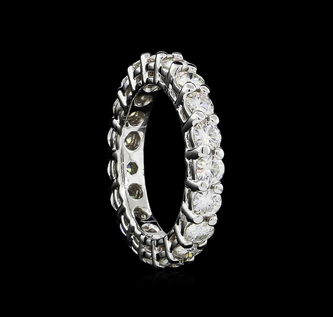 One electronically tested 14KT white gold ladies cast moissanite eternity ring with a bright polish finish. The ring features a continuous three millimeter wide moissanite ribbon. Ring size 5. Condition is good. Containing: Nineteen prong set round brilliant cut laboratory created moissanite, measuring 3.02 - 3.00 x 1.75mm, approximate total weight of 2.00ct., clarity is eye clean, colorless, very slightly grayish, white color, (GIA W 0/3), cut is good. Transmitting light with not distortion, transparent. Color grade is an average for the group. Graded in the setting. Moissanite is cut with the table perpendicular to the "c" axis. By looking through the table of a moissanite, the singly refractive direction, no doubling will appear. Looking through the crown or pavilion facets doubling (the doubly refractive direction) will be visible. Laboratory created moissanite is a diamond stimulant, man-made material with no gem-quality natural counterpart, but gives positive reaction to a standard diamond tester. Laboratory created moissanite has extreme fire, much more than a diamond equivalent size and cut. Total Weight of Colored Stones 2.00ct. Total Weight of Ring 3.97gm. AIG Appraised at $1,830.00.