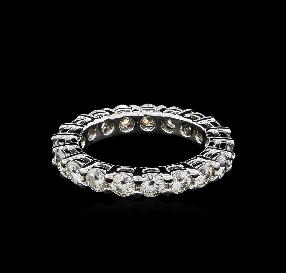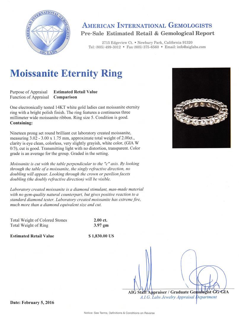 One electronically tested 14KT white gold ladies cast moissanite eternity ring with a bright polish finish. The ring features a continuous three millimeter wide moissanite ribbon. Ring size 5. Condition is good. Containing: Nineteen prong set round brilliant cut laboratory created moissanite, measuring 3.02 - 3.00 x 1.75mm, approximate total weight of 2.00ct., clarity is eye clean, colorless, very slightly grayish, white color, (GIA W 0/3), cut is good. Transmitting light with not distortion, transparent. Color grade is an average for the group. Graded in the setting. Moissanite is cut with the table perpendicular to the "c" axis. By looking through the table of a moissanite, the singly refractive direction, no doubling will appear. Looking through the crown or pavilion facets doubling (the doubly refractive direction) will be visible. Laboratory created moissanite is a diamond stimulant, man-made material with no gem-quality natural counterpart, but gives positive reaction to a standard diamond tester. Laboratory created moissanite has extreme fire, much more than a diamond equivalent size and cut. Total Weight of Colored Stones 2.00ct. Total Weight of Ring 3.97gm. AIG Appraised at $1,830.00.