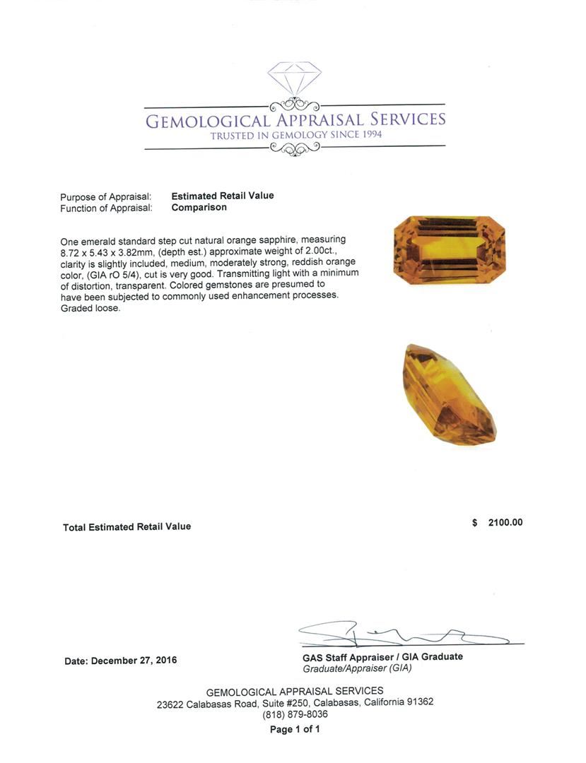 One emerald standard step cut natural orange sapphire, measuring 8.72 x 5.43 x 3.82mm, (depth est.) approximate weight of 2.00ct., clarity is slightly included, medium, moderately strong, reddish orange color, (GIA rO 5/4), cut is very good. Transmitting light with a minimum of distortion, transparent. Colored gemstones are presumed to have been subjected to commonly used enhancement processes. Graded loose. GAS Appraised.