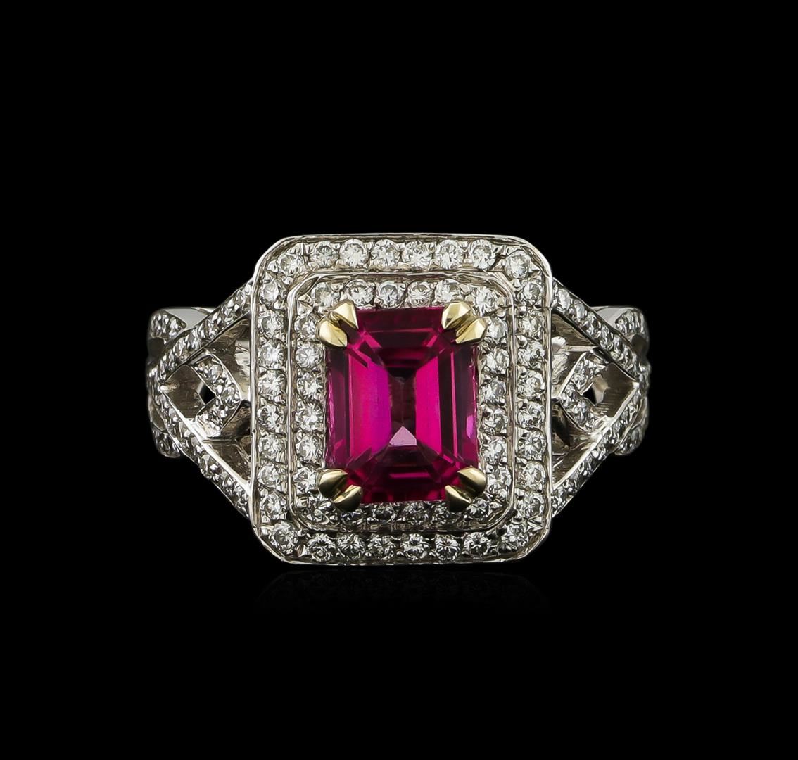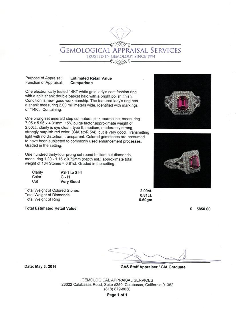 One electronically tested 14KT white gold lady's cast fashion ring with a split shank double basket halo with a bright polish finish. The featured lady's ring has a shank measuring 2.00 millimeters wide. Identified with markings of "14K". Condition is new, good workmanship. Containing: One prong set emerald step cut natural pink tourmaline, measuring 7.95 x 5.95 x 4.31mm, 15%. bulge factor, approximate weight of 2.00ct., clarity is eye clean, type II, medium, moderately strong, strongly purplish red color, (GIA stpR 5/4), cut is very good. Transmitting light with no distortion, transparent. Colored gemstones are presumed to have been subjected to commonly used enhancement processes. Graded in the setting. One Hundred Thirty-Four prong set round brilliant cut diamonds, measuring 1.20 - 1.15 x 0.72mm (depth est.) approximate total weight of 134 Stones = 0.81ct. Graded in the setting. Clarity: VS-1 to SI-1. Color: G - Very Good. Total Weight of Colored Stones 2.00ct. Total Weight of Diamonds 0.81ct. Total Weight of Ring 6.60gm GAS Appraised at $5,850.00.