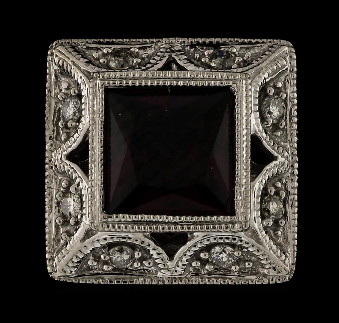One Pendant : 14KT white gold weighing 2.00gm containing rhodolite with a total weight of 2.00ct and side diamonds weighing 0.10ctw.
