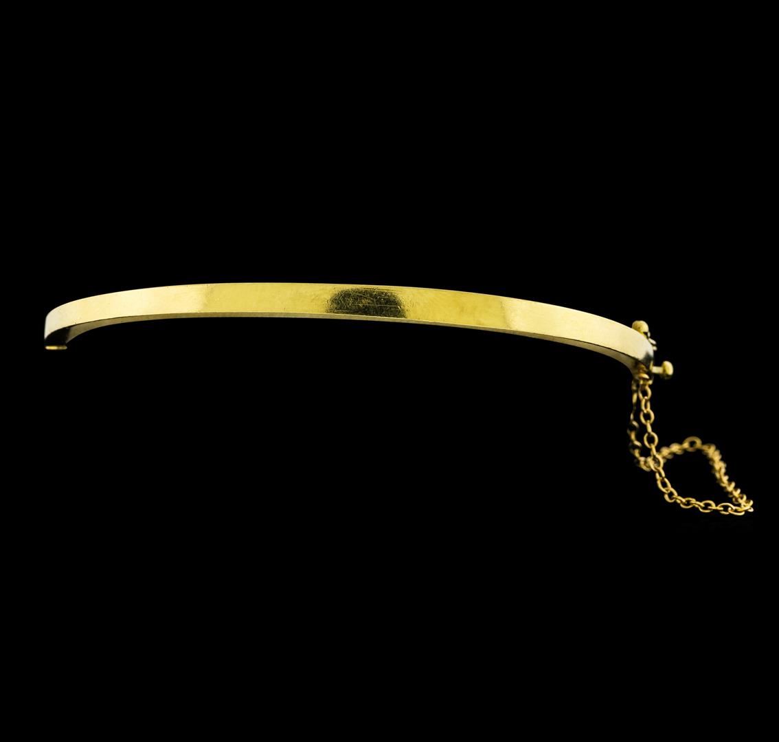 One electronically tested 14KT yellow gold lady's combination cast & assembled fashion bangle bracelet with a tongue clasp with foldover safety with a bright polish finish. The featured lady's bracelet has an attached safety chain and measures approximately 7.25 inches in length. Identified with markings of '14K'. Condition is used, good workmanship. Containing: Nine prong set round modified brilliant cut natural blue sapphires, measuring 4.00 - 2.50 x 2.05 mm, (depth est.) approximate total weight of 2.00ct., clarity is slightly included, medium dark, moderately strong, blue color, (GIA B 6/4), cut is good. Transmitting light with a minimum of distortion, transparent. Colored gemstones are presumed to have been subjected to commonly used enhancement processes. Graded in the setting. Eight prong set round brilliant cut diamonds, measuring 3.50 - 3.00 x 2.02mm (depth est.) approximate total weight of 8 Stones = 1.00ct. Graded in the setting. Clarity SI-1 to I-1. Color: G - H Cut Good. Total Weight of Colored Stones 2.00ct.. Total Weight of Diamonds 1.00ct.. Total Weight of Bangle Bracelet 17.80gm. GAS Appraised at $6,595.00.