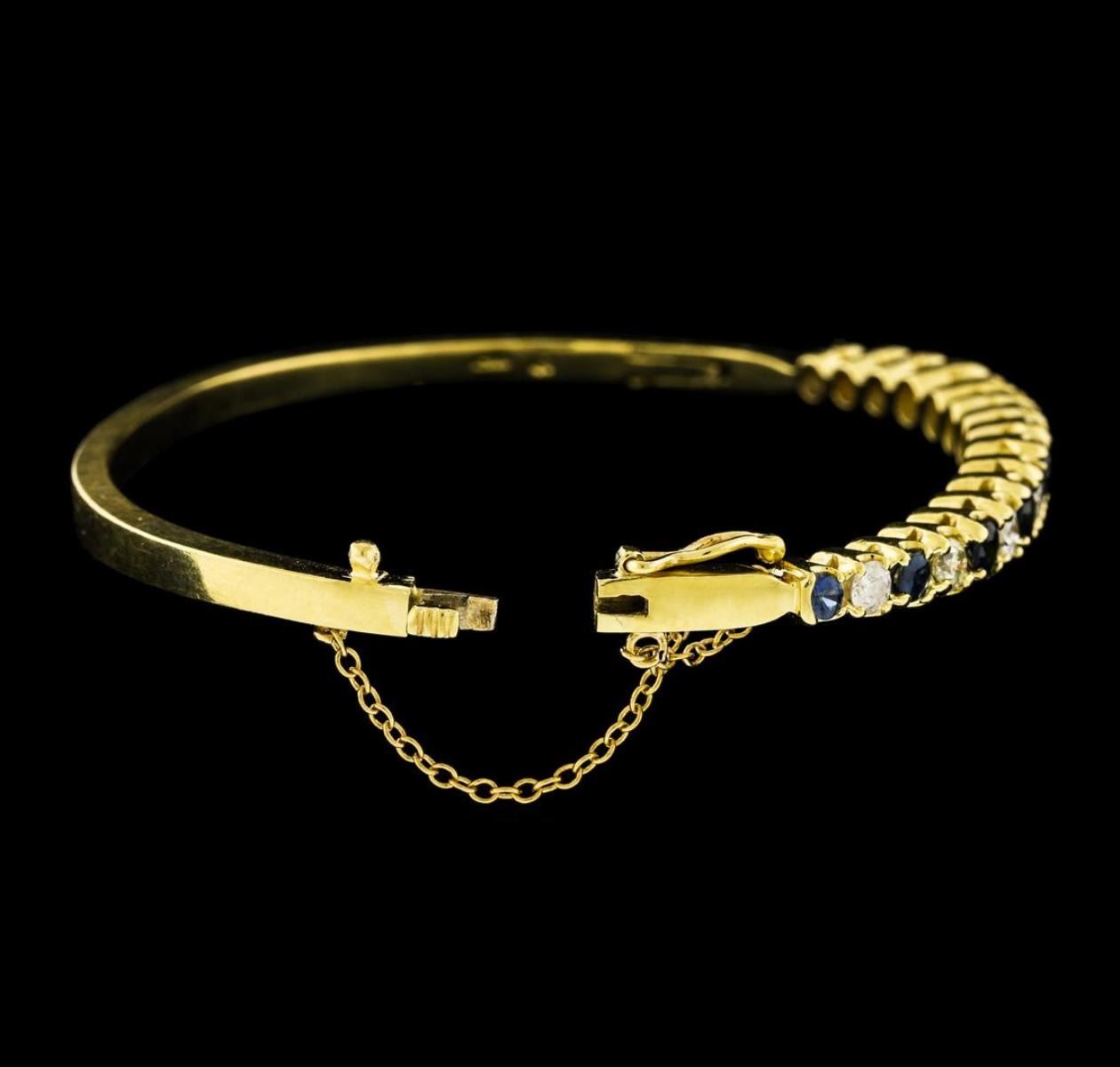 One electronically tested 14KT yellow gold lady's combination cast & assembled fashion bangle bracelet with a tongue clasp with foldover safety with a bright polish finish. The featured lady's bracelet has an attached safety chain and measures approximately 7.25 inches in length. Identified with markings of '14K'. Condition is used, good workmanship. Containing: Nine prong set round modified brilliant cut natural blue sapphires, measuring 4.00 - 2.50 x 2.05 mm, (depth est.) approximate total weight of 2.00ct., clarity is slightly included, medium dark, moderately strong, blue color, (GIA B 6/4), cut is good. Transmitting light with a minimum of distortion, transparent. Colored gemstones are presumed to have been subjected to commonly used enhancement processes. Graded in the setting. Eight prong set round brilliant cut diamonds, measuring 3.50 - 3.00 x 2.02mm (depth est.) approximate total weight of 8 Stones = 1.00ct. Graded in the setting. Clarity SI-1 to I-1. Color: G - H Cut Good. Total Weight of Colored Stones 2.00ct.. Total Weight of Diamonds 1.00ct.. Total Weight of Bangle Bracelet 17.80gm. GAS Appraised at $6,595.00.