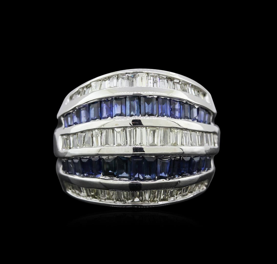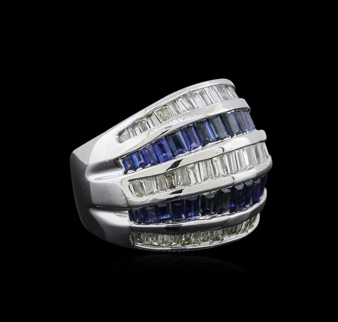 One electronically tested 14KT white gold ladies cast sapphire and diamond ring with a bright polish finish. Identified with markings of "14K". Condition is very good. Containing: Thirty-two channel set baguette standard step cut natural blue sapphires, measuring 3.50 x 2.00 x 1.30mm, approximate total weight of 2.00ct., clarity is slightly included, type II, medium, moderately strong, blue color, (GIA B 5/4), cut is good. Sixty channel set baguette cut diamonds, measuring from 1.50 x 1.50 x 1.28mm (depth est.) to 2.50 x 1.50 x 1.28mm (depth est.) approximate total weight of 60 Stones = 2.11ct. Clarity: SI-1 to SI-2. Color: I - J, Cut is Good. Colored gemstones are presumed to have been subjected to commonly used enhancement processes. All diamonds and colored gemstones are graded in the mounting, unless otherwise stated. Total Weight of Colored Stones 2.00ct. Total Weight of Diamonds 2.11ct. Total Weight of Ring 13.50gm. GGL Appraised at $4,755.00.