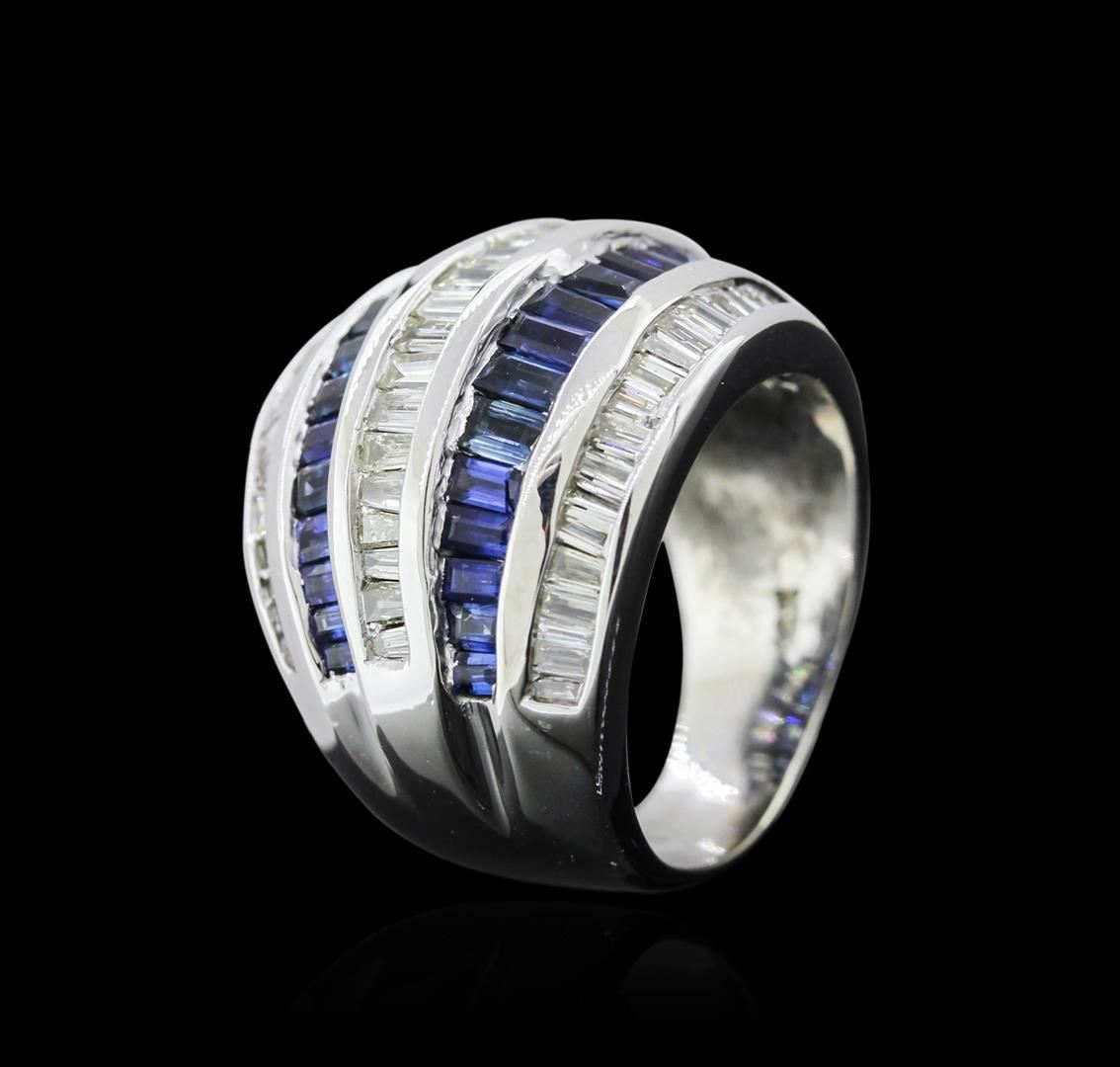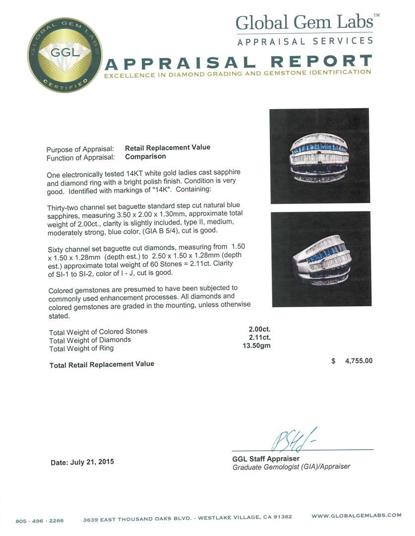 One electronically tested 14KT white gold ladies cast sapphire and diamond ring with a bright polish finish. Identified with markings of "14K". Condition is very good. Containing: Thirty-two channel set baguette standard step cut natural blue sapphires, measuring 3.50 x 2.00 x 1.30mm, approximate total weight of 2.00ct., clarity is slightly included, type II, medium, moderately strong, blue color, (GIA B 5/4), cut is good. Sixty channel set baguette cut diamonds, measuring from 1.50 x 1.50 x 1.28mm (depth est.) to 2.50 x 1.50 x 1.28mm (depth est.) approximate total weight of 60 Stones = 2.11ct. Clarity: SI-1 to SI-2. Color: I - J, Cut is Good. Colored gemstones are presumed to have been subjected to commonly used enhancement processes. All diamonds and colored gemstones are graded in the mounting, unless otherwise stated. Total Weight of Colored Stones 2.00ct. Total Weight of Diamonds 2.11ct. Total Weight of Ring 13.50gm. GGL Appraised at $4,755.00.