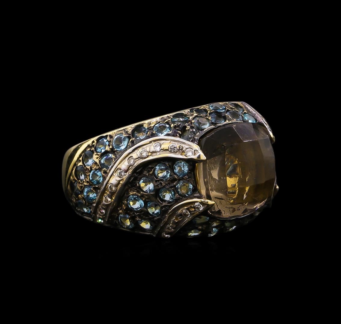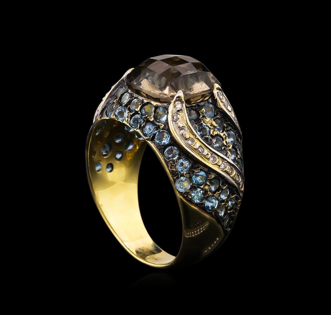 One electronically tested 14KT yellow gold lady's cast fashion ring with a tapered shank with a bright polish finish. The featured lady's ring has a shank measuring 4.38 millimeters wide. Identified with markings of "14K". Condition is used. Containing: One prong set double rose cabochon cut natural smoky quartz, measuring 9.94 x 9.90 x 5.88mm, approximate weight of 2.00ct., clarity is slightly included, light, very slightly grayish, brown color, (GIA Br 3/3), cut is good. Transmitting light with a minimum of distortion, transparent. Colored gemstones are presumed to have been subjected to commonly used enhancement processes. Graded in the setting. Fifty-nine prong set round modified brilliant cut natural blue topazes, measuring 1.90 - 1.70 x 1.17 mm, approximate total weight of 1.80ct., clarity is slightly included, type I, medium, very slightly grayish, blue color, (GIA B 5/3), cut is good. Transmitting light with a minimum of distortion, transparent. Colored gemstones are presumed to have been subjected to commonly used enhancement processes. Graded in the setting. Twenty-Eight prong set round brilliant cut diamonds, measuring 1.20 - 1.10 x 0.71mm (depth est.) approximate total weight of 28 Stones = 0.16ct. Graded in the setting. Clarity: SI-1 to I-1. Color: J - K. Cut Good. Total Weight of Colored Stones 3.80ct. Total Weight of Diamonds 0.16ct. Total Weight of Ring 8.10gm. GAS Appraised at $1,415.00.