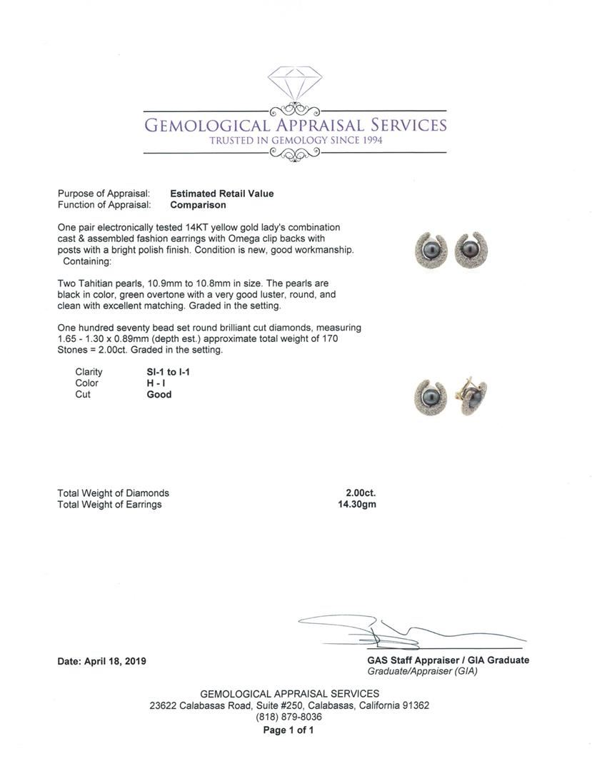 One pair electronically tested 14KT yellow gold lady's combination cast & assembled fashion earrings with Omega clip backs with posts with a bright polish finish. Condition is new, good workmanship. Containing: Two Tahitian pearls, 10.9mm to 10.8mm in size. The pearls are black in color, green overtone with a very good luster, round, and clean with excellent matching. Graded in the setting. One Hundred Seventy bead set round brilliant cut diamonds, measuring 1.65 - 1.30 x 0.89mm (depth est.) approximate total weight of 170 Stones = 2.00 ct. Graded in the setting. Color H - I Clarity SI-1 to I-1 Cut Good. Total Weight of Diamonds 2.00 ct.. Total Weight of Earrings 14.30gm GAS Appraised at $9530.00. GAS Appraised.