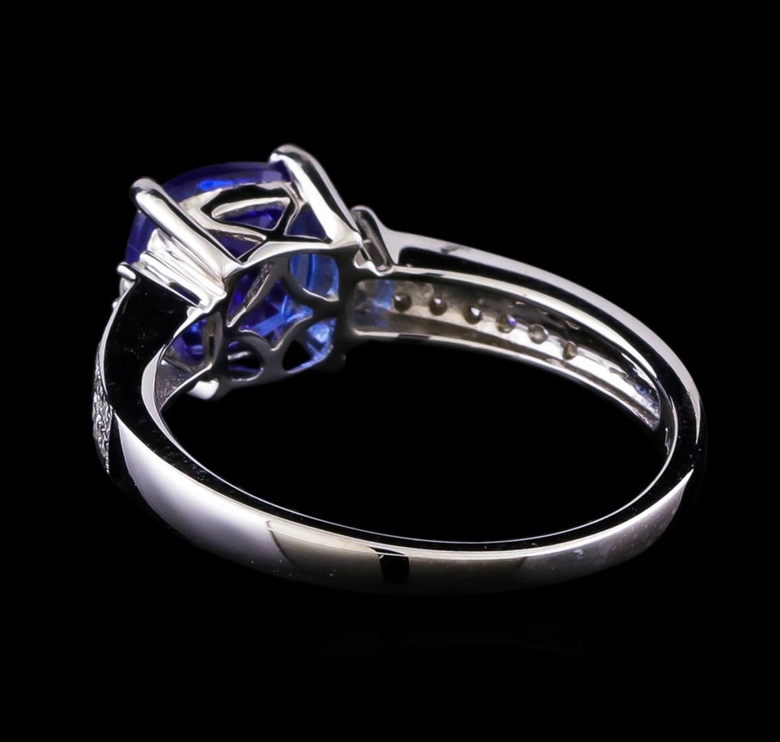 One electronically tested 14KT white gold ladies cast tanzanite and diamond ring with a bright polish finish. The featured tanzanite is supported by diamond set shoulders, completed by a one and one-half millimeter wide band. Trademark is Orianne. Identified with markings of "14K". Condition is new, good workmanship. Containing: One prong set square cushion mixed cut natural tanzanite approximate weight of 2.00ct., clarity is slightly included, type I, medium dark, very slightly grayish, violetish blue color, (GIA vB 6/3), cut is good. Transmitting light with a minimum of distortion, transparent. Naturally occurring internal & external characteristics are present. Graded in the setting. Tanzanite is a very rare gemstone that is only found in the country of Tanzania. Originally discovered in 1967. Tiffany & Company, named the stone Tanzanite. It is found in the Usumburu Mountains that border the Umba Valley of northern Tanzania. Tanzanite occurs in gray, brown, violet, blue, reddish-purple, & green. The gem is interesting because of its exceptional pleochroism. Rotated in different directions a tanzanite will exhibit multiple changes of color. Tanzanite has a low tolerance to ultra. Twenty-Eight prong set round brilliant cut diamonds approximate total weight of 28 Stones = 0.22ct. Graded in the setting. Clarity: I-2 to I-3. Color: H - J. Total Weight of Colored Stones 2.00ct. Total Weight of Diamonds 0.22ct. Total Weight of Ring 3.10gm. AIG Appraised at $4,990.00.