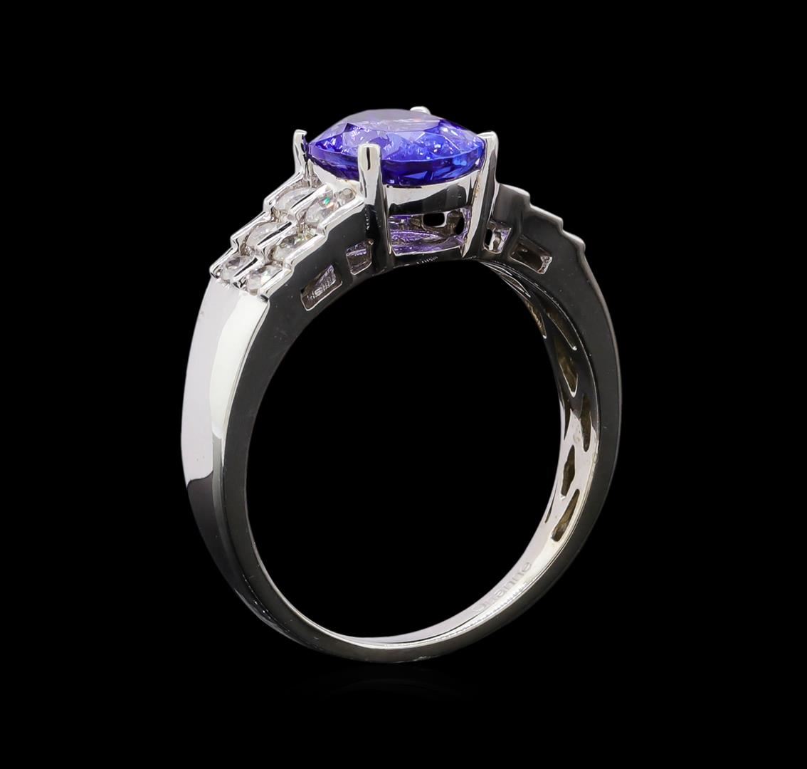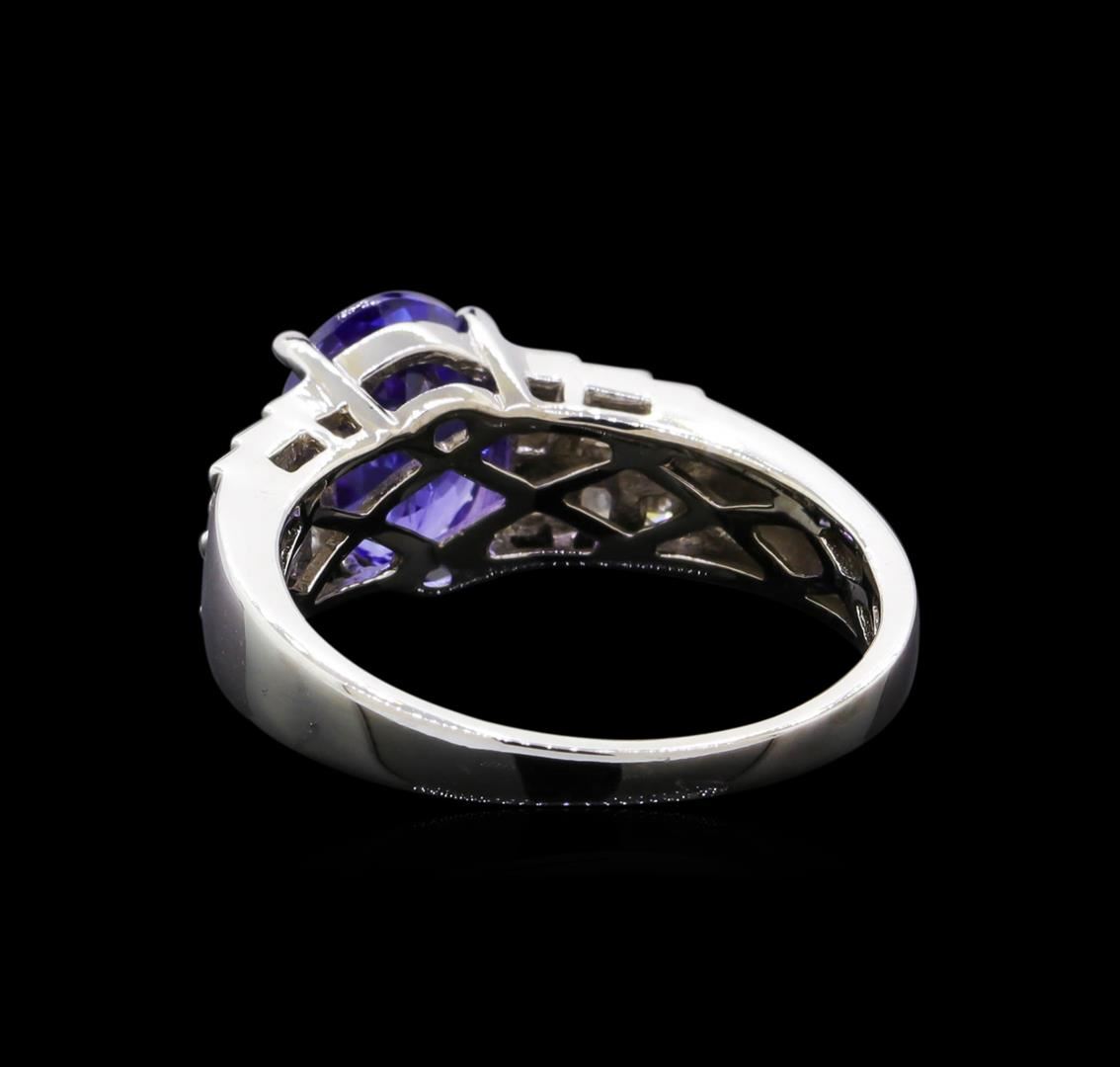 One electronically tested 14KT white gold ladies cast tanzanite and diamond ring with a bright polish finish. The featured tanzanite is supported by tiered diamond set shoulders, completed by a one and one-half millimeter wide band. Trademark is Orianne. Identified with markings of "14K". Condition is new, good workmanship. Containing: One prong set oval mixed cut natural tanzanite approximate weight of 2.00ct., clarity is slightly included, type I, medium dark, very slightly grayish, bluish violet color, (GIA bV 6/3), cut is good. Transmitting light with a minimum of distortion, transparent. Naturally occurring internal & external characteristics are present. Graded in the setting. Tanzanite is a very rare gemstone that is only found in the country of Tanzania. Originally discovered in 1967. Tiffany & Company, named the stone Tanzanite. It is found in the Usumburu Mountains that border the Umba Valley of northern Tanzania. Tanzanite occurs in gray, brown, violet, blue, reddish-purple, & green. The gem is interesting because of its exceptional pleochroism. Rotated in different directions a tanzanite will exhibit multiple changes of color. Tanzanite has a low tolerance to ultrasonic cleaning, and should not be cleaned using this method. Twelve channel set round brilliant cut diamonds approximate total weight of 12 Stones = 0.39ct. Graded in the setting. Clarity: I-2 to I-3. Color: G - I. Total Weight of Colored Stones 2.00ct. Total Weight of Diamonds 0.39ct. Total Weight of Ring 4.23gm. AIG Appraised at $5,215.00.