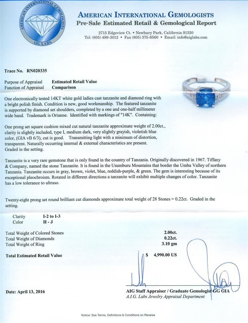 One electronically tested 14KT white gold ladies cast tanzanite and diamond ring with a bright polish finish. The featured tanzanite is supported by diamond set shoulders, completed by a one and one-half millimeter wide band. Trademark is Orianne. Identified with markings of "14K". Condition is new, good workmanship. Containing: One prong set square cushion mixed cut natural tanzanite approximate weight of 2.00ct., clarity is slightly included, type I, medium dark, very slightly grayish, violetish blue color, (GIA vB 6/3), cut is good. Transmitting light with a minimum of distortion, transparent. Naturally occurring internal & external characteristics are present. Graded in the setting. Tanzanite is a very rare gemstone that is only found in the country of Tanzania. Originally discovered in 1967. Tiffany & Company, named the stone Tanzanite. It is found in the Usumburu Mountains that border the Umba Valley of northern Tanzania. Tanzanite occurs in gray, brown, violet, blue, reddish-purple, & green. The gem is interesting because of its exceptional pleochroism. Rotated in different directions a tanzanite will exhibit multiple changes of color. Tanzanite has a low tolerance to ultra. Twenty-Eight prong set round brilliant cut diamonds approximate total weight of 28 Stones = 0.22ct. Graded in the setting. Clarity: I-2 to I-3. Color: H - J. Total Weight of Colored Stones 2.00ct. Total Weight of Diamonds 0.22ct. Total Weight of Ring 3.10gm. AIG Appraised at $4,990.00.