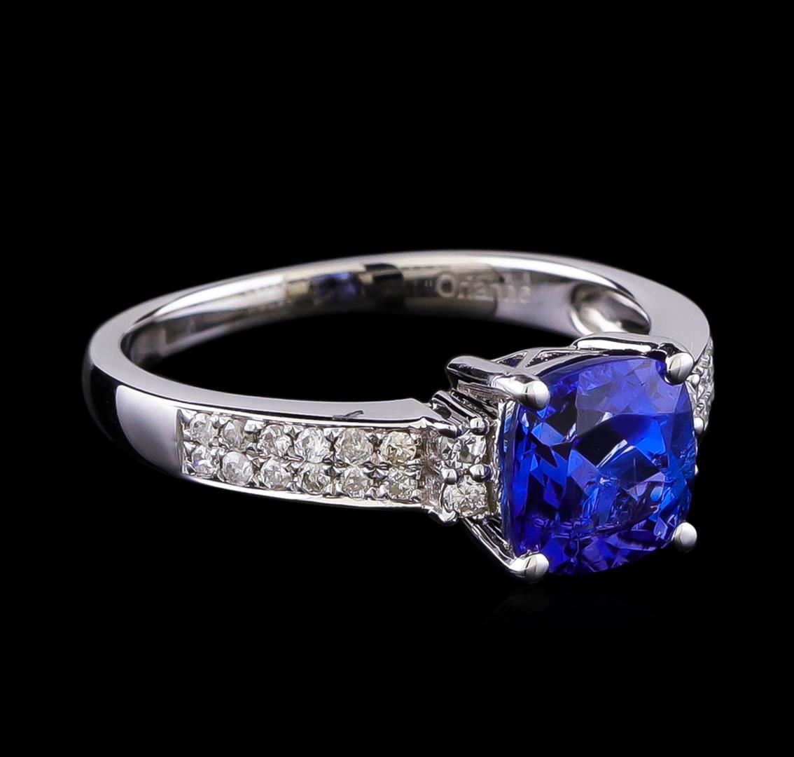 One electronically tested 14KT white gold ladies cast tanzanite and diamond ring with a bright polish finish. The featured tanzanite is supported by diamond set shoulders, completed by a one and one-half millimeter wide band. Trademark is Orianne. Identified with markings of "14K". Condition is new, good workmanship. Containing: One prong set square cushion mixed cut natural tanzanite approximate weight of 2.00ct., clarity is slightly included, type I, medium dark, very slightly grayish, violetish blue color, (GIA vB 6/3), cut is good. Transmitting light with a minimum of distortion, transparent. Naturally occurring internal & external characteristics are present. Graded in the setting. Tanzanite is a very rare gemstone that is only found in the country of Tanzania. Originally discovered in 1967. Tiffany & Company, named the stone Tanzanite. It is found in the Usumburu Mountains that border the Umba Valley of northern Tanzania. Tanzanite occurs in gray, brown, violet, blue, reddish-purple, & green. The gem is interesting because of its exceptional pleochroism. Rotated in different directions a tanzanite will exhibit multiple changes of color. Tanzanite has a low tolerance to ultra. Twenty-Eight prong set round brilliant cut diamonds approximate total weight of 28 Stones = 0.22ct. Graded in the setting. Clarity: I-2 to I-3. Color: H - J. Total Weight of Colored Stones 2.00ct. Total Weight of Diamonds 0.22ct. Total Weight of Ring 3.10gm. AIG Appraised at $4,990.00.