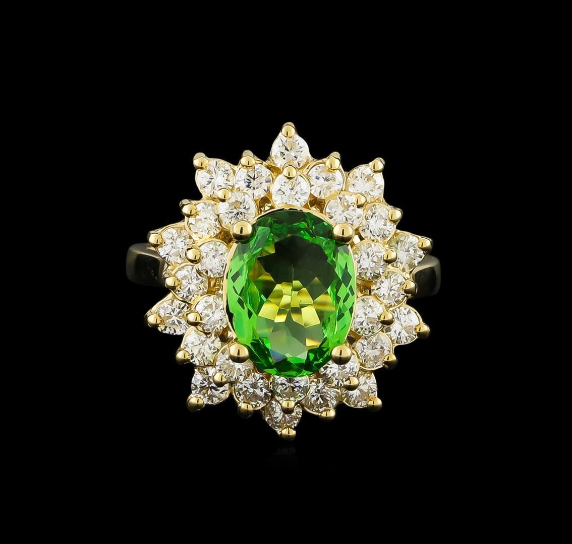 One electronically tested 14KT yellow gold lady's cast fashion ring with a double basket halo with a bright polish finish. The featured lady's ring has a shank measuring 2.05 millimeters wide. Identified with markings of "K14". Condition is new, good workmanship. Containing: One prong set oval modified brilliant cut natural tsavorite garnet, measuring 10.11 x 7.76 x 3.22mm, 4%. bulge factor, approximate weight of 2.00ct., clarity is eye clean, type II, medium, very slightly grayish, slightly yellowish green color, (GIA slyG 5/3), cut is good. Transmitting light with no distortion, transparent. Colored gemstones are presumed to have been subjected to commonly used enhancement processes. Natural chip on girdle. Graded in the setting. Thirty prong set round brilliant cut diamonds, measuring 2.30 - 2.20 x 1.40mm (depth est.) approximate total weight of 30 Stones = 1.33ct. Graded in the setting. Clarity: SI-1 to SI-2. Color: H - I. Cut Very Good. Total Weight of Colored Stones 2.00ct. Total Weight of Diamonds 1.33ct. Total Weight of Ring 6.20gm GAS Appraised.