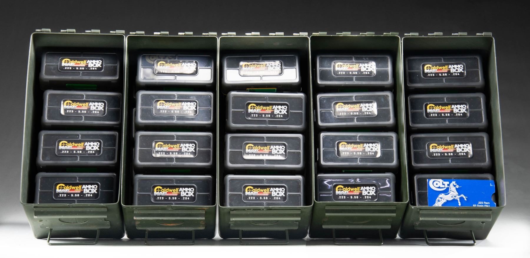 5 US GI style 50 cal. cans having 400 rounds each repacked within Caldwell 50 round plastic ammo boxes. Originally packed in blue 20 round boxes with Colt logo marked "62 Grain FMJ" as made in Russia by Barnaul for Colt. Cartridge cases are zinc coated steel. One side of original Colt box per can. (02-24640-7/NW). AMMO. $450-600.