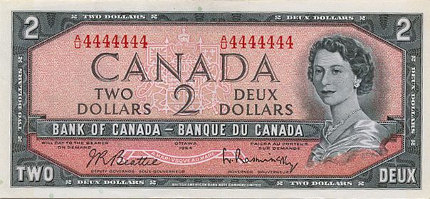 1954 Issue. BC-38b. Beattie-Rasminsky. No. A/U4444444. A solid Radar note. A well centered, bright and crisp AU.
