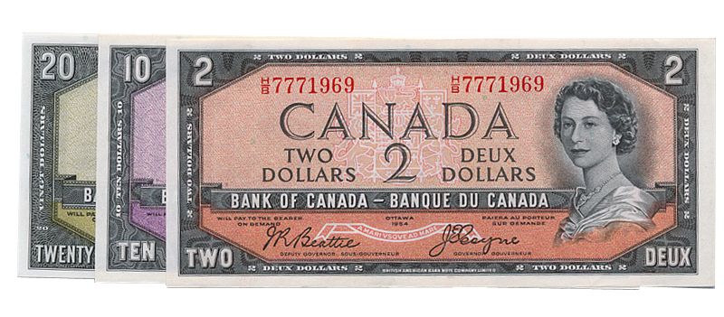 1954 Issue. BC-30b. Beattie-Coyne. ‘Devil’s Face’. No. H/B7771969. EF; $10.00. 1954 Issue. ‘Devil’s Face’. No. J/D5124767. AU; $20.00. 1954 Issue. BC-33a. Coyne-Towers. ‘Devil’s Face. No. B/E2486346. AU. Lot of three (3) notes.