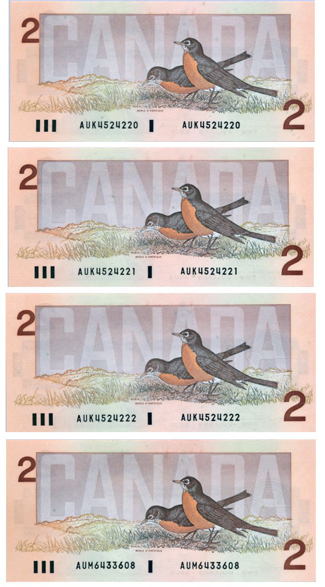 1986 Issue. BC-55a. Crow-Bouey. No. AUK4524220, AUK4524221, AUK4524222 & No. AUM6433608. Lot of four (4) ‘changeover’ notes, all BCS graded Unc-60.