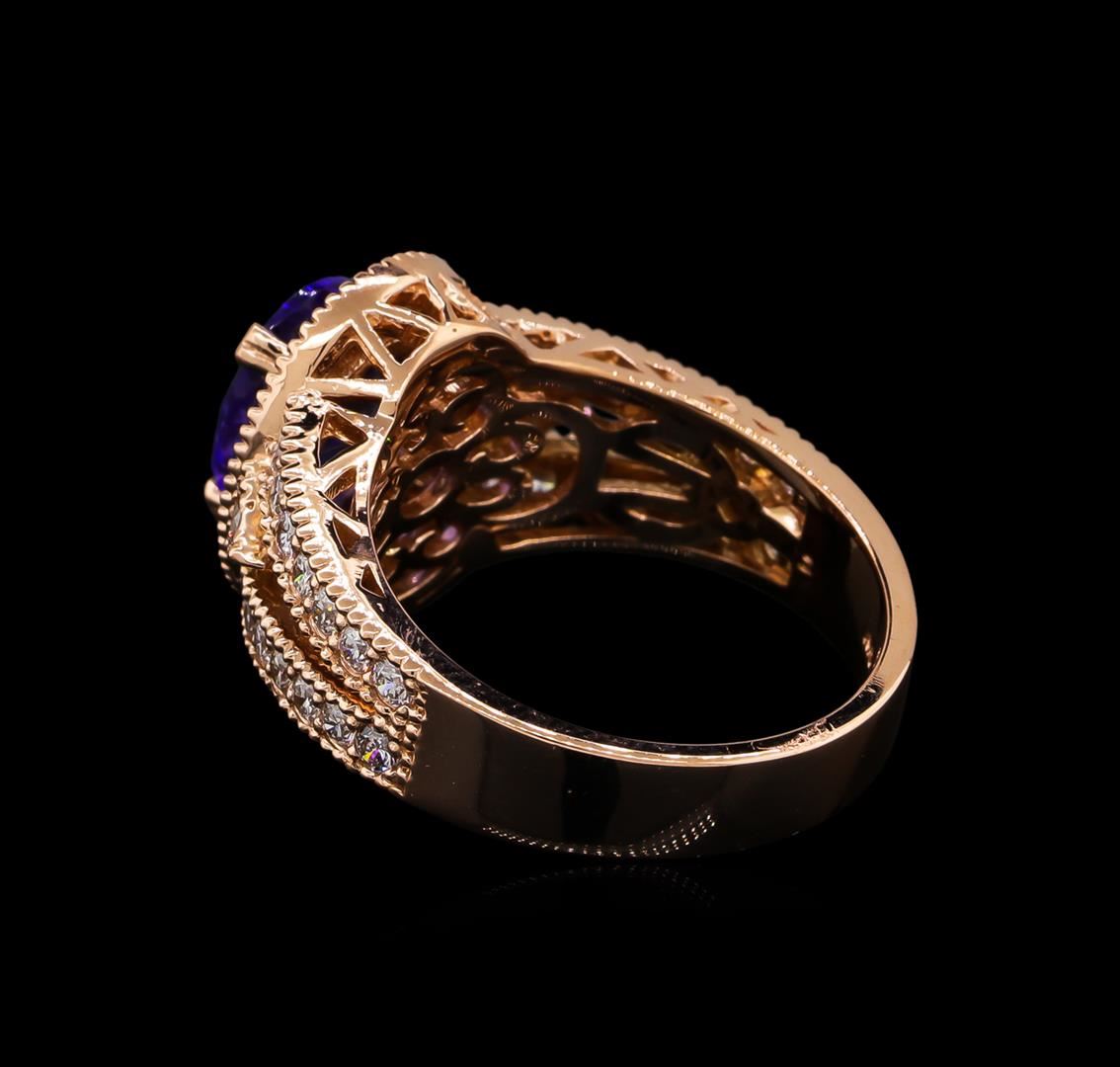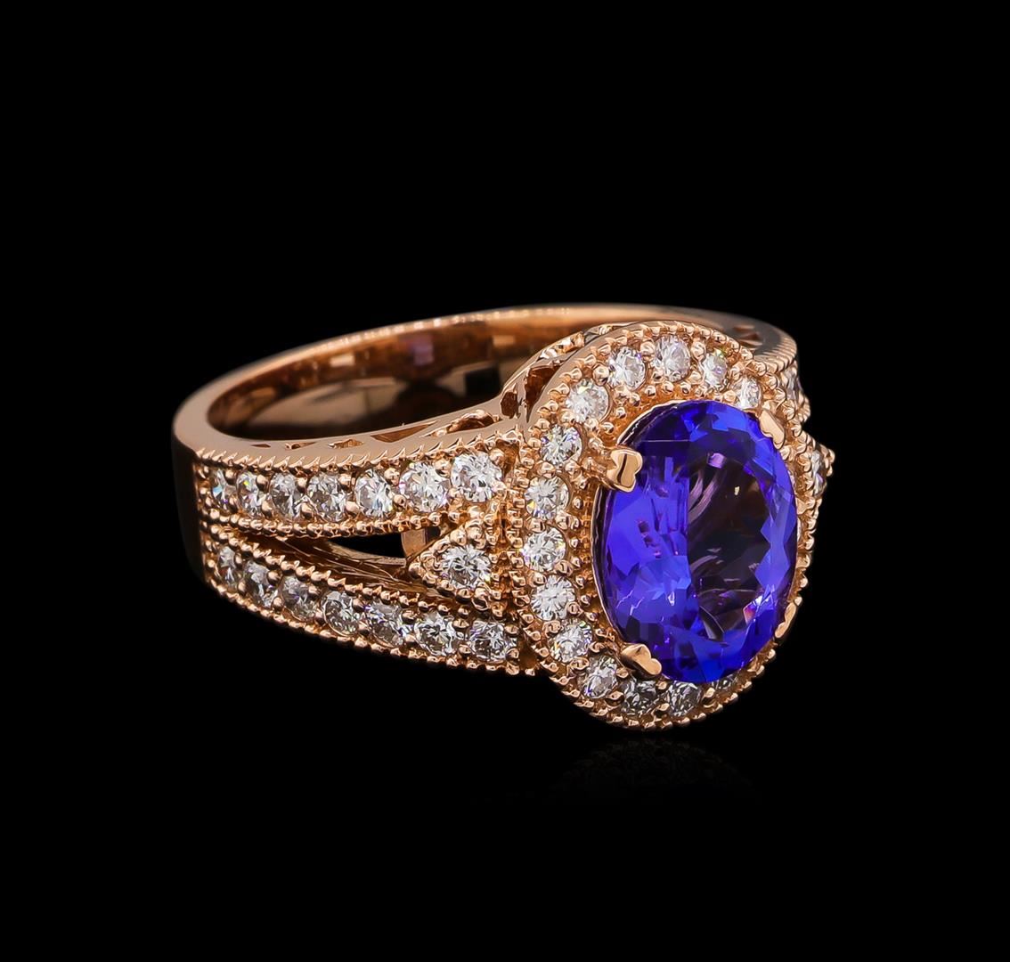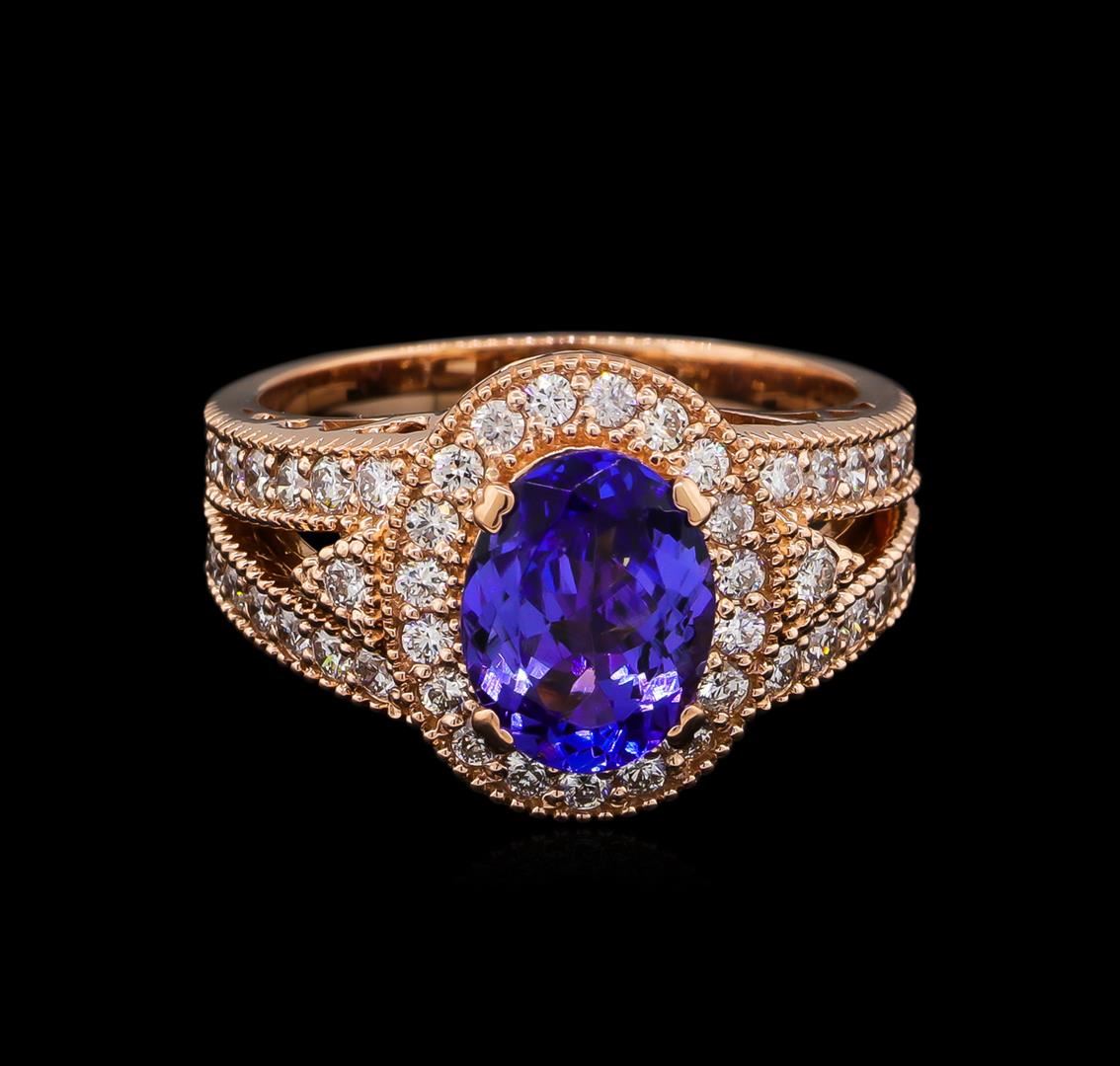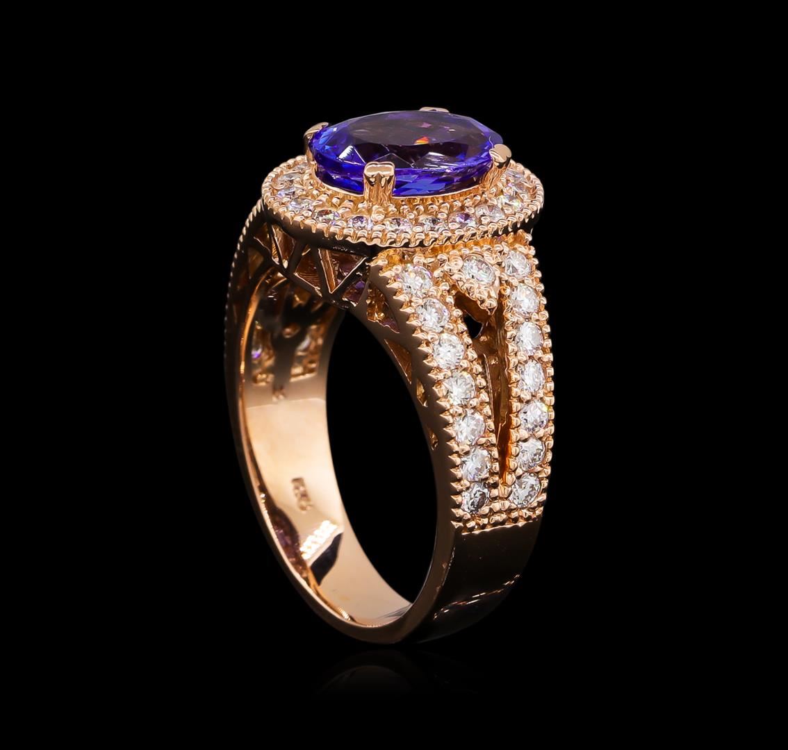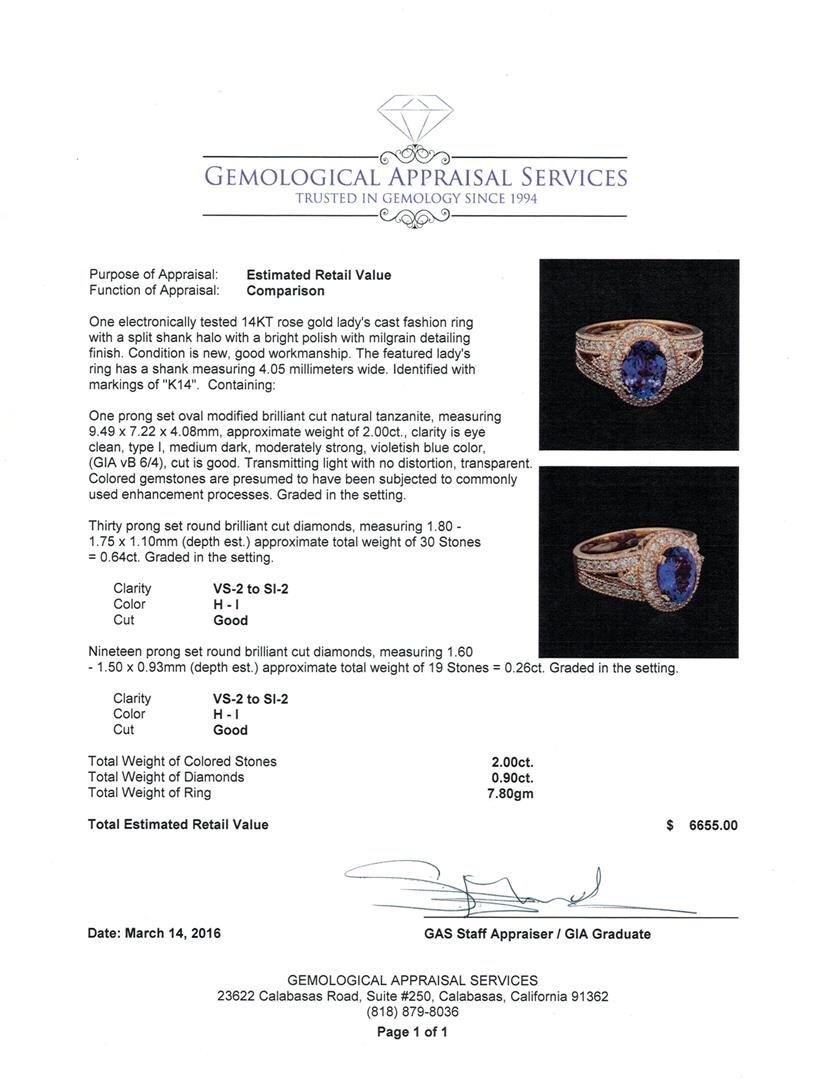 One electronically tested 14KT rose gold lady's cast fashion ring with a split shank halo with a bright polish with milgrain detailing finish. The featured lady's ring has a shank measuring 4.05 millimeters wide. Identified with markings of "K14". Condition is new, good workmanship. Containing: One prong set oval modified brilliant cut natural tanzanite, measuring 9.49 x 7.22 x 4.08mm, approximate weight of 2.00ct., clarity is eye clean, type I, medium dark, moderately strong, violetish blue color, (GIA vB 6/4), cut is good. Transmitting light with no distortion, transparent. Colored gemstones are presumed to have been subjected to commonly used enhancement processes. Graded in the setting. Thirty prong set round brilliant cut diamonds, measuring 1.80 - 1.75 x 1.10mm (depth est.) approximate total weight of 30 Stones = 0.64ct. Graded in the setting. Clarity: VS-2 to SI-2. Color: H - I. Cut Good Nineteen prong set round brilliant cut diamonds, measuring 1.60 - 1.50 x 0.93mm (depth est.) approximate total weight of 19 Stones = 0.26ct. Graded in the setting. Clarity: VS-2 to SI-2. Color: H - I. Cut Good. Total Weight of Colored Stones 2.00ct. Total Weight of Diamonds 0.90ct. Total Weight of Ring 7.80gm. GAS Appraised at $6,655.00.