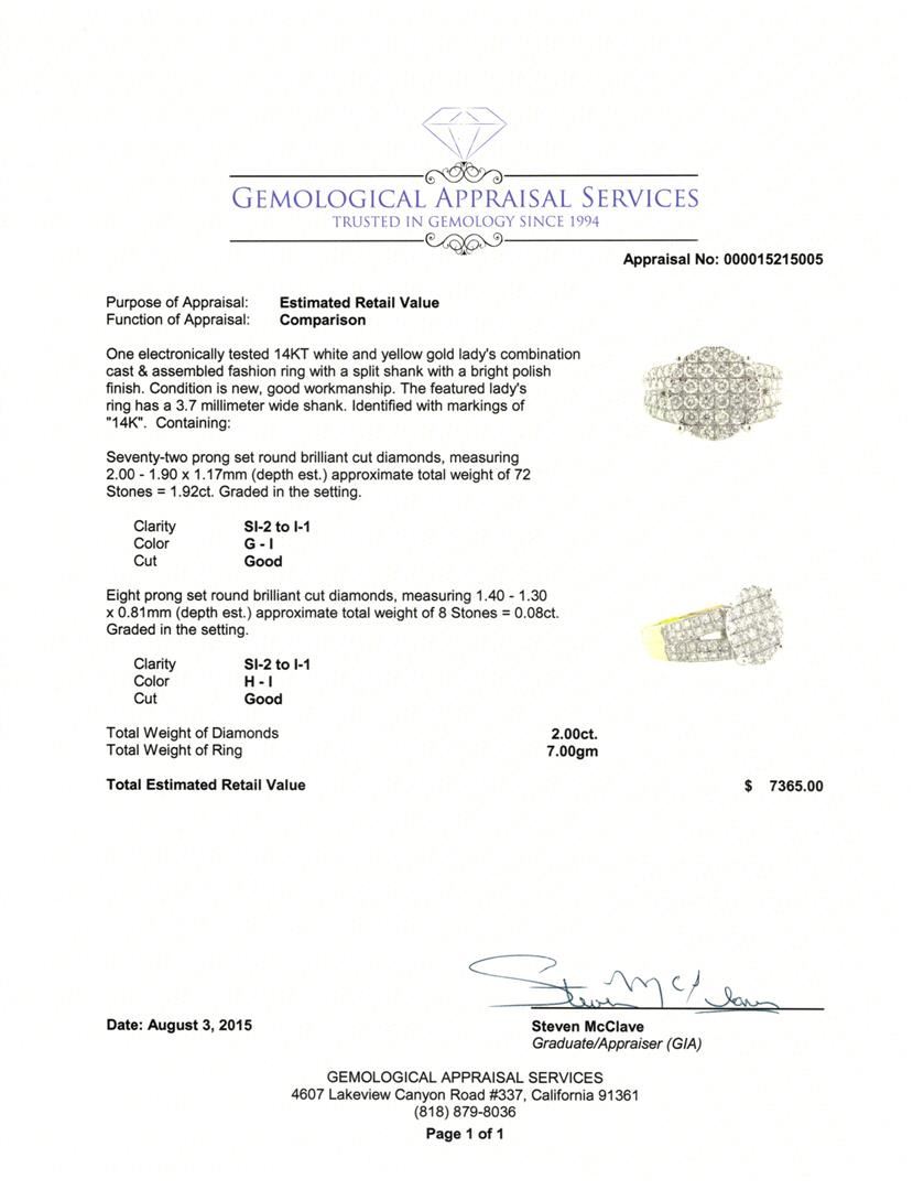 One electronically tested 14KT white and yellow gold lady's combination cast & assembled fashion ring with a split shank with a bright polish finish. The featured lady's ring has a 3.7 millimeter wide shank. Identified with markings of "14K". Condition is new, good workmanship. Containing: Seventy-Two prong set round brilliant cut diamonds, measuring 2.00 - 1.90 x 1.17mm (depth est.) approximate total weight of 72 Stones = 1.92ct. Graded in the setting. Clarity SI-2 to I-1 Color G - I. Cut Good Eight prong set round brilliant cut diamonds, measuring 1.40 - 1.30 x 0.81mm (depth est.) approximate total weight of 8 Stones = 0.08ct. Graded in the setting. Clarity SI-2 to I-1 Color H - I. Cut Good Total Weight of Diamonds 2.00ct. Total Weight of Ring 7.00gm GAS Appraised at $7,365.00.