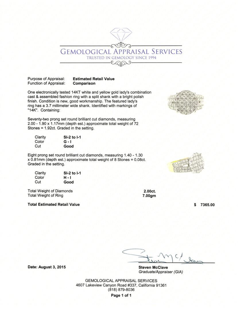 One electronically tested 14KT white and yellow gold lady's combination cast & assembled fashion ring with a split shank with a bright polish finish. The featured lady's ring has a 3.7 millimeter wide shank. Identified with markings of "14K". Condition is new, good workmanship. Containing: Seventy-Two prong set round brilliant cut diamonds, measuring 2.00 - 1.90 x 1.17mm (depth est.) approximate total weight of 72 Stones = 1.92ct. Graded in the setting. Clarity SI-2 to I-1 Color G - I. Cut Good Eight prong set round brilliant cut diamonds, measuring 1.40 - 1.30 x 0.81mm (depth est.) approximate total weight of 8 Stones = 0.08ct. Graded in the setting. Clarity SI-2 to I-1 Color H - I. Cut Good Total Weight of Diamonds 2.00ct. Total Weight of Ring 7.00gm GAS Appraised at $7,365.00.