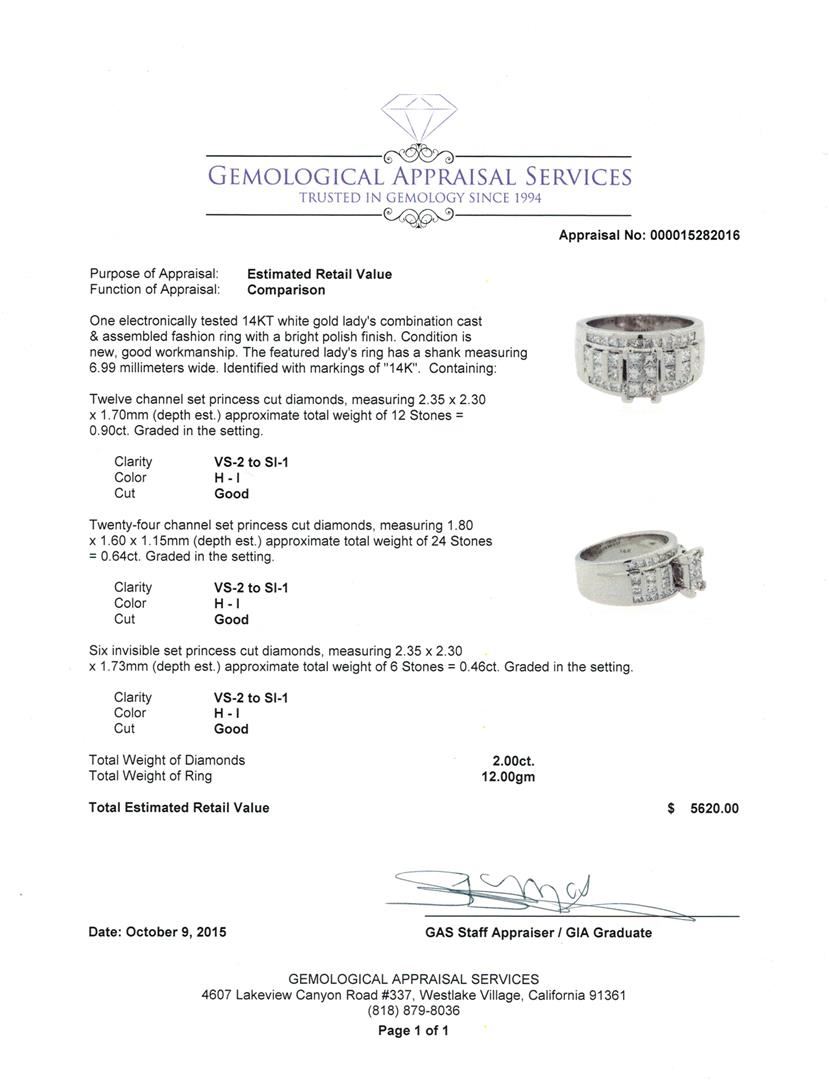 One electronically tested 14KT white gold lady's combination cast & assembled fashion ring with a bright polish finish. The featured lady's ring has a shank measuring 6.99 millimeters wide. Identified with markings of "14K". Condition is new, good workmanship. Containing: Twelve channel set princess cut diamonds, measuring 2.35 x 2.30 x 1.70mm (depth est.) approximate total weight of 12 Stones = 0.90ct. Graded in the setting. Clarity: VS-2 to SI-1. Color: H - I. Cut Good Twenty-Four channel set princess cut diamonds, measuring 1.80 x 1.60 x 1.15mm (depth est.) approximate total weight of 24 Stones = 0.64ct. Graded in the setting. Clarity: VS-2 to SI-1. Color: H - I. Cut Good Six invisible set princess cut diamonds, measuring 2.35 x 2.30 x 1.73mm (depth est.) approximate total weight of 6 Stones = 0.46ct. Graded in the setting. Clarity: VS-2 to SI-1. Color: H - I. Cut Good. Total Weight of Diamonds 2.00ct. Total Weight of Ring 12.00gm. GAS Appraised at $5,620.00.