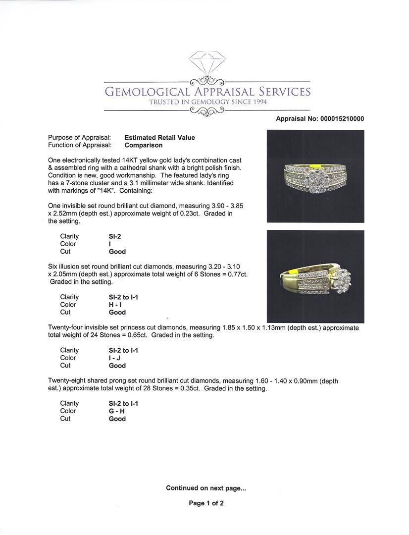 One electronically tested 14KT yellow gold lady's combination cast & assembled ring with a cathedral shank with a bright polish finish. The featured lady's ring has a 7-stone cluster and a 3.1 millimeter wide shank. Identified with markings of "14K". Condition is new, good workmanship. Containing: One invisible set round brilliant cut diamond, measuring 3.90 - 3.85 x 2.52mm (depth est.) approximate weight of 0.23ct. Graded in the setting. Clarity: SI-2. Color: I. Cut Good Six illusion set round brilliant cut diamonds, measuring 3.20 - 3.10 x 2.05mm (depth est.) approximate. Total Weight of 6 Stones = 0.77ct. Graded in the setting. Clarity: SI-2 to I-1. Color: H - I. Cut Good Twenty-Four invisible set princess cut diamonds, measuring 1.85 x 1.50 x 1.13mm (depth est.) approximate. Total Weight of 24 Stones = 0.65ct. Graded in the setting. Clarity: SI-2 to I-1. Color: I - Good Twenty-Eight shared prong set round brilliant cut diamonds, measuring 1.60 - 1.40 x 0.90mm (depth est.) approximate. Total Weight of 28 Stones = 0.35ct. Graded in the setting. Clarity: SI-2 to I-1. Color: G - Good. Total Weight of Diamonds 2.00ct. Total Weight of Ring 6.30gm. GAS Appraised at $8,885.00.