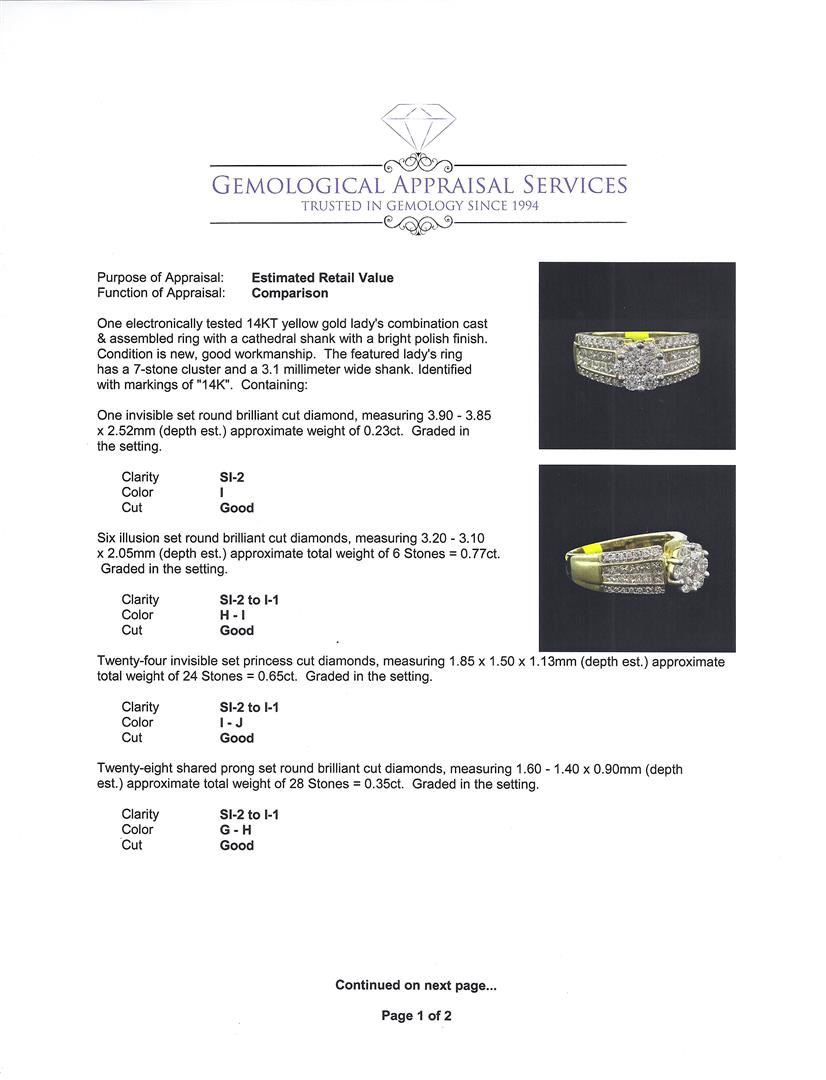 One electronically tested 14KT yellow gold lady's combination cast & assembled ring with a cathedral shank with a bright polish finish. The featured lady's ring has a 7-stone cluster and a 3.1 millimeter wide shank. Identified with markings of "14K". Condition is new, good workmanship. Containing: One invisible set round brilliant cut diamond, measuring 3.90 - 3.85 x 2.52mm (depth est.) approximate weight of 0.23ct. Graded in the setting. Clarity: SI-2. Color: I. Cut Good Six illusion set round brilliant cut diamonds, measuring 3.20 - 3.10 x 2.05mm (depth est.) approximate. Total Weight of 6 Stones = 0.77ct. Graded in the setting. Clarity: SI-2 to I-1. Color: H - I. Cut Good Twenty-Four invisible set princess cut diamonds, measuring 1.85 x 1.50 x 1.13mm (depth est.) approximate. Total Weight of 24 Stones = 0.65ct. Graded in the setting. Clarity: SI-2 to I-1. Color: I - Good Twenty-Eight shared prong set round brilliant cut diamonds, measuring 1.60 - 1.40 x 0.90mm (depth est.) approximate. Total Weight of 28 Stones = 0.35ct. Graded in the setting. Clarity: SI-2 to I-1. Color: G - Good. Total Weight of Diamonds 2.00ct. Total Weight of Ring 6.30gm. GAS Appraised at $8,885.00.