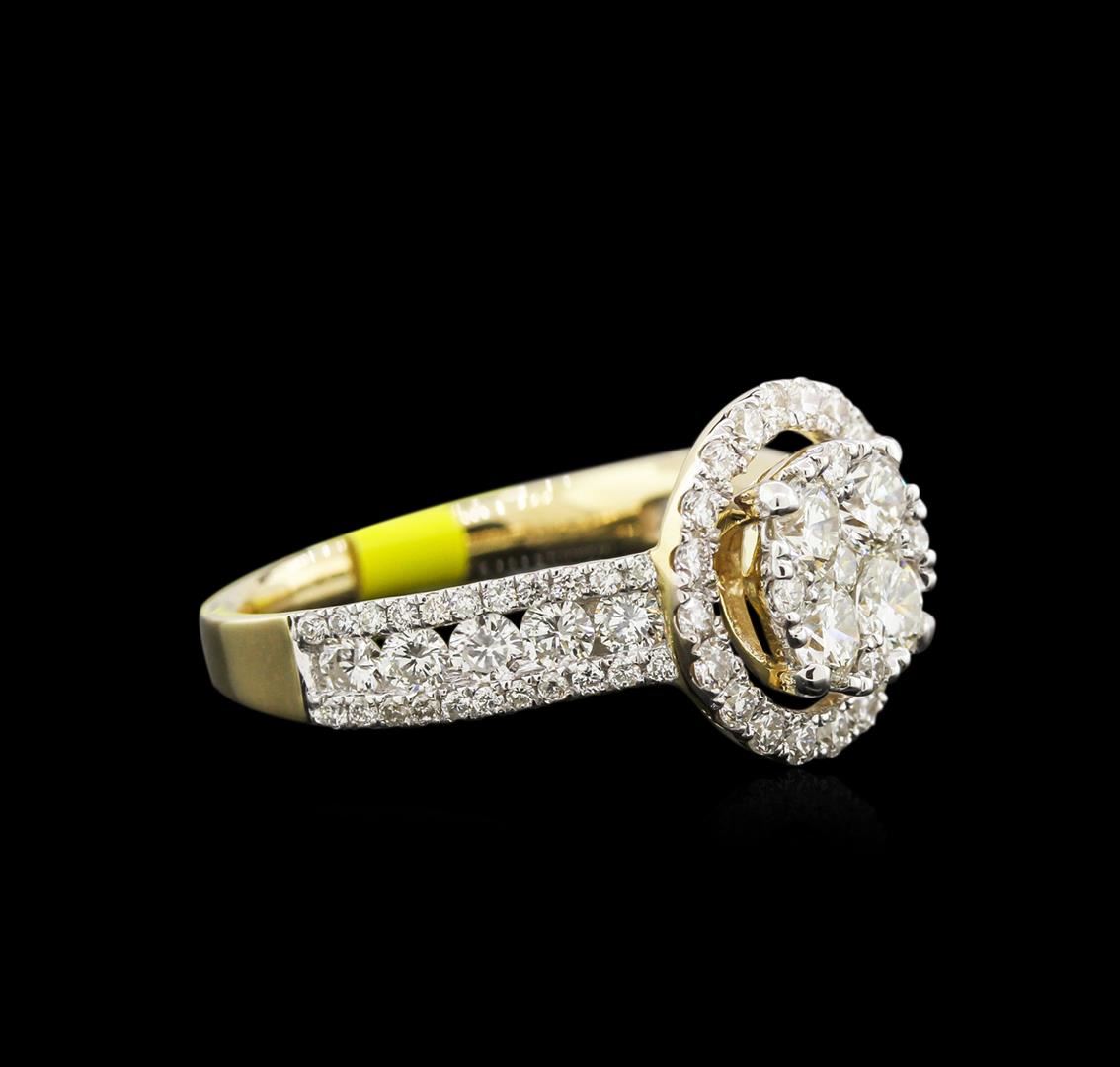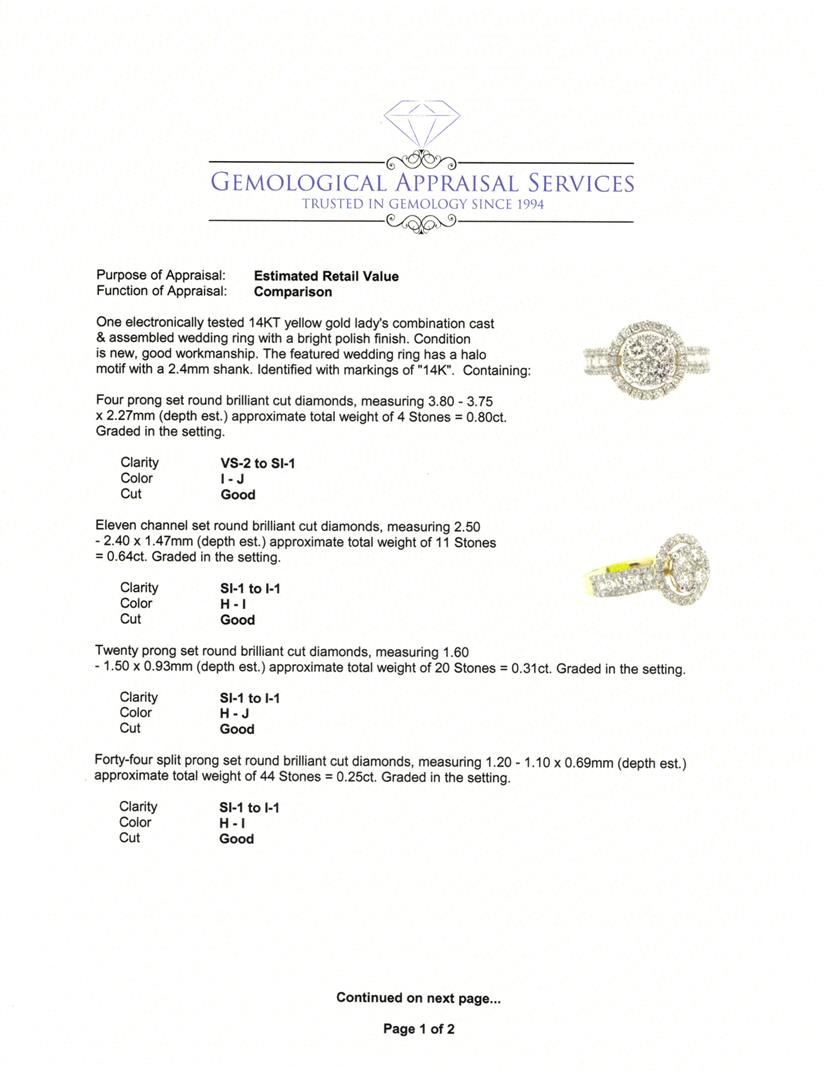 One electronically tested 14KT yellow gold lady's combination cast & assembled wedding ring with a bright polish finish. The featured wedding ring has a halo motif with a 2.4mm shank. Identified with markings of "14K". Condition is new, good workmanship. Containing: Four prong set round brilliant cut diamonds, measuring 3.80 - 3.75 x 2.27mm (depth est.) approximate total weight of 4 Stones = 0.80ct. Graded in the setting. Clarity VS-2 to SI-1 Color I - Good Eleven channel set round brilliant cut diamonds, measuring 2.50 - 2.40 x 1.47mm (depth est.) approximate total weight of 11 Stones = 0.64ct. Graded in the setting. Clarity SI-1 to I-1 Color H - I. Cut Good Twenty prong set round brilliant cut diamonds, measuring 1.60 - 1.50 x 0.93mm (depth est.) approximate total weight of 20 Stones = 0.31ct. Graded in the setting. Clarity SI-1 to I-1 Color H - Good Forty-Four split prong set round brilliant cut diamonds, measuring 1.20 - 1.10 x 0.69mm (depth est.) approximate total weight of 44 Stones = 0.25ct. Graded in the setting. Clarity SI-1 to I-1 Color H - I. Cut Good Total Weight of Diamonds 2.00ct. Total Weight of Ring 4.10gm GAS Appraised at $8,990.00.