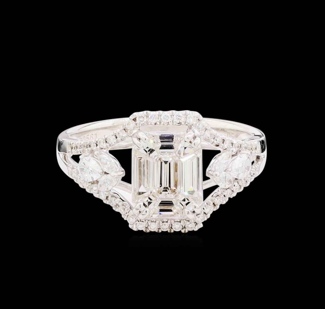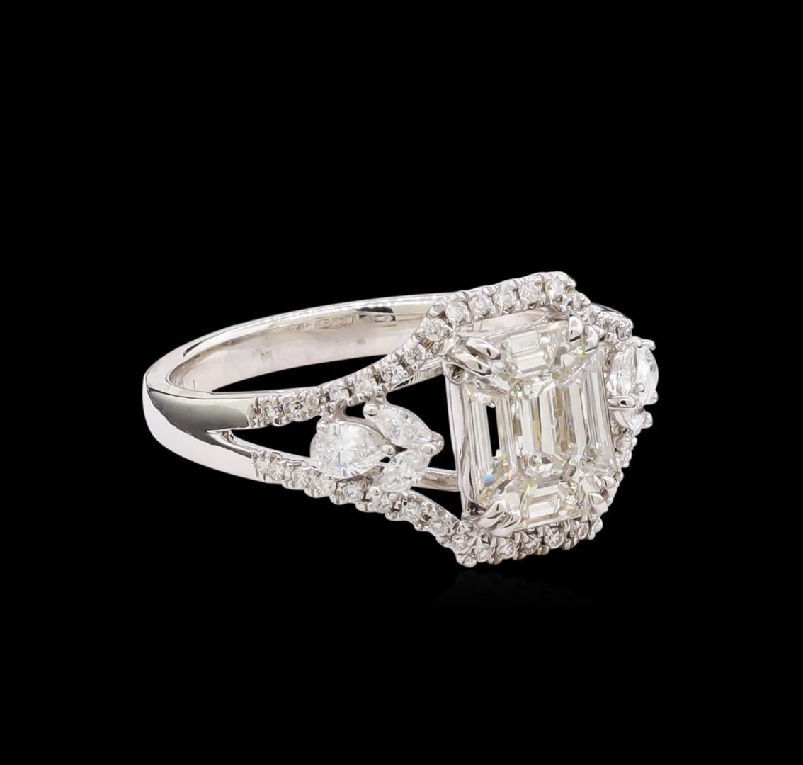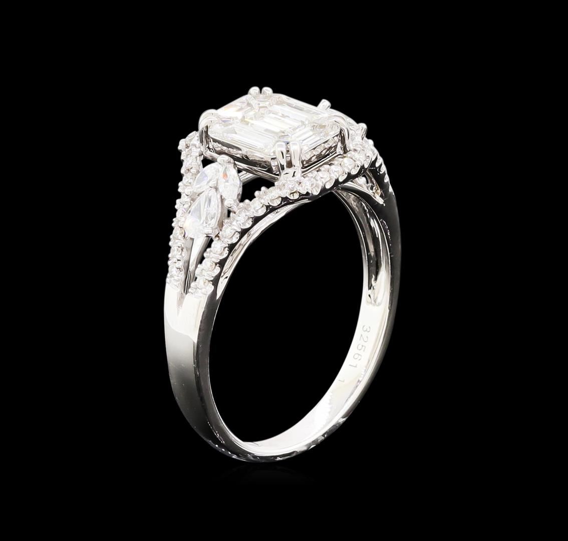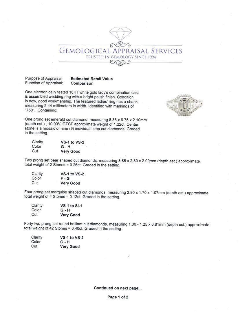 One electronically tested 18KT white gold lady's combination cast & assembled wedding ring with a bright polish finish. The featured ladies' ring has a shank measuring 2.44 millimeters in width. Identified with markings of "750". Condition is new, good workmanship. Containing: One prong set emerald cut diamond, measuring 8.35 x 6.75 x 2.10mm (depth est.) , 10.00.%. GTCF approximate weight of 1.22ct. Center stone is a mosaic of nine (9) individual step cut diamonds. Graded in the setting. Clarity: VS-1 to VS-2. Color: G - Very Good Two prong set pear shaped cut diamonds, measuring 3.85 x 2.80 x 2.00mm (depth est.) approximate total weight of 2 Stones = 0.26ct. Graded in the setting. Clarity: VS-1 to VS-2. Color: F - G. Cut Very Good Four prong set marquise shaped cut diamonds, measuring 2.90 x 1.70 x 1.07mm (depth est.) approximate total weight of 4 Stones = 0.12ct. Graded in the setting. Clarity: VS-1 to SI-1. Color: G - Very Good Forty-Two prong set round brilliant cut diamonds, measuring 1.30 - 1.25 x 0.81mm (depth est.) approximate total weight of 42 Stones = 0.40ct. Graded in the setting. Clarity: VS-1 to VS-2. Color: G - Very Good. Total Weight of Diamonds 2.00ct. Total Weight of Ring 4.50gm. GAS Appraised at $12,355.00.