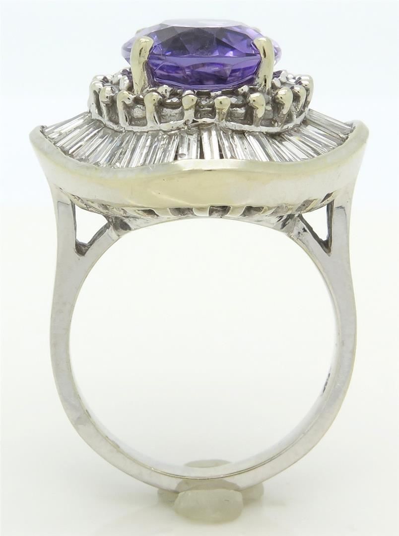 One tested 14K white gold diamond and amethyst ring. Containing: One 14.04MM X 10.18MM purple amethyst. 46 Baguette Cut Diamonds, 22 Round Brilliant Cut Diamonds. Clarity: I-SI, Color: G-I. Approximate total diamond weight: 2CTW. Diamonds are graded in the mounting, unless otherwise stated. Weight of ring: 11.8 grams. Size: 7.0