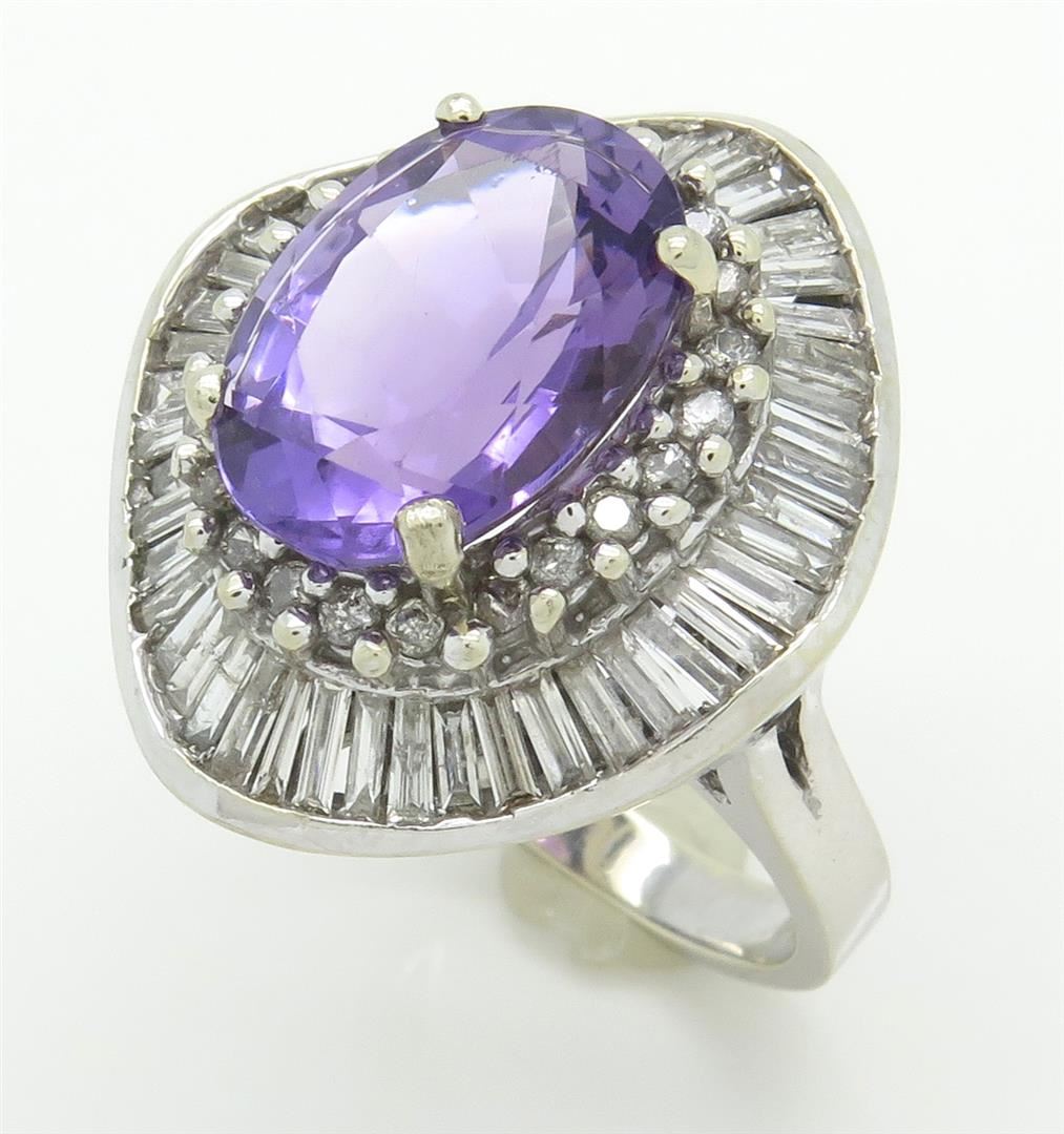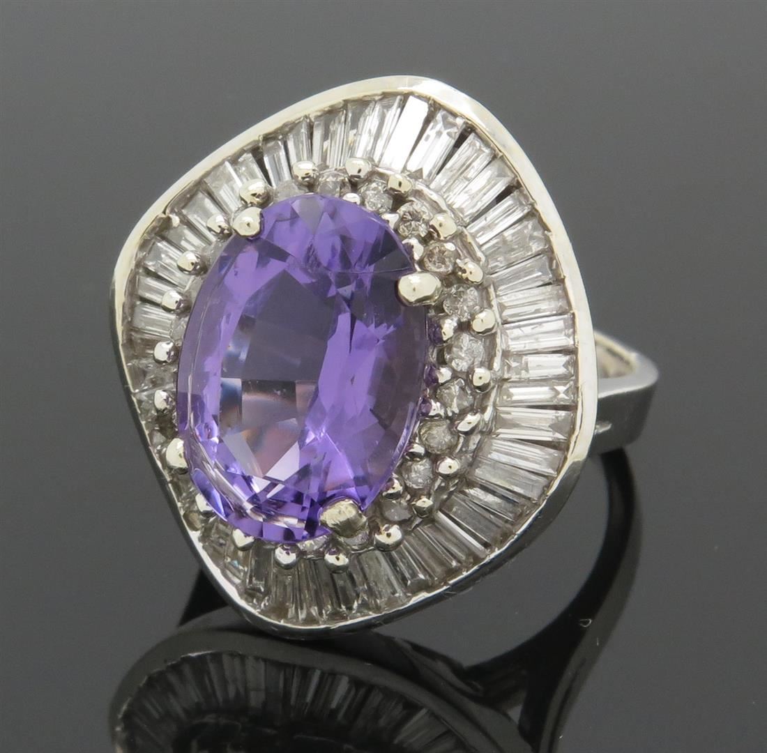 One tested 14K white gold diamond and amethyst ring. Containing: One 14.04MM X 10.18MM purple amethyst. 46 Baguette Cut Diamonds, 22 Round Brilliant Cut Diamonds. Clarity: I-SI, Color: G-I. Approximate total diamond weight: 2CTW. Diamonds are graded in the mounting, unless otherwise stated. Weight of ring: 11.8 grams. Size: 7.0