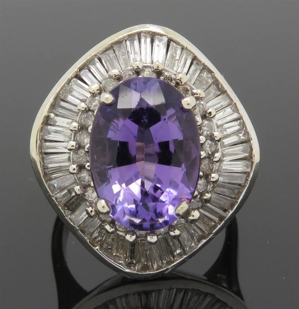 One tested 14K white gold diamond and amethyst ring. Containing: One 14.04MM X 10.18MM purple amethyst. 46 Baguette Cut Diamonds, 22 Round Brilliant Cut Diamonds. Clarity: I-SI, Color: G-I. Approximate total diamond weight: 2CTW. Diamonds are graded in the mounting, unless otherwise stated. Weight of ring: 11.8 grams. Size: 7.0