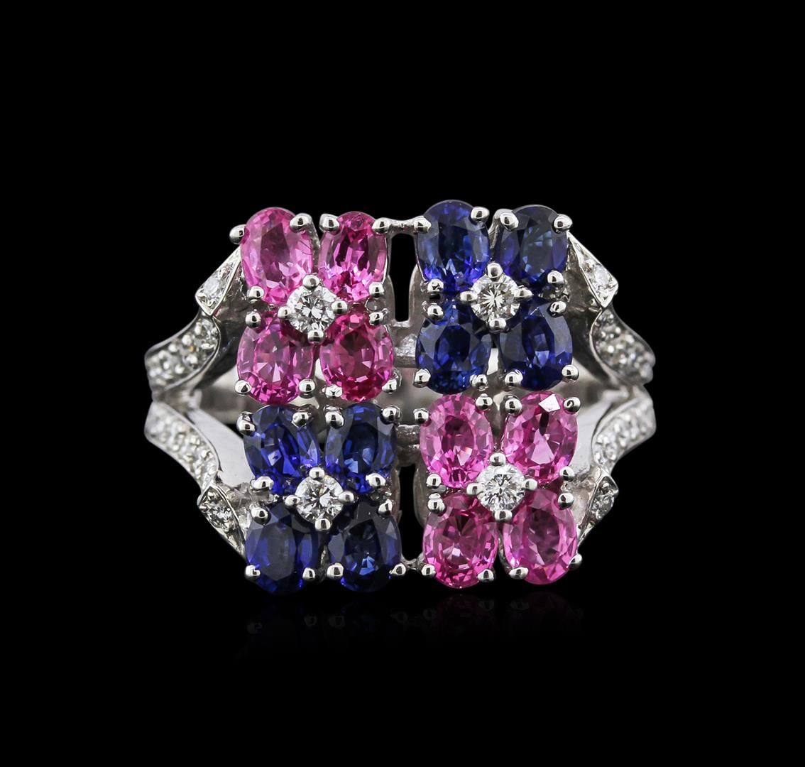 One ring featuring: 14KT white gold weighing 9.10 grams containing prong set oval cut blue and pink sapphires with a total weight of 2.00ct and pave and prong set round diamonds with a total weight of 0.35ct.