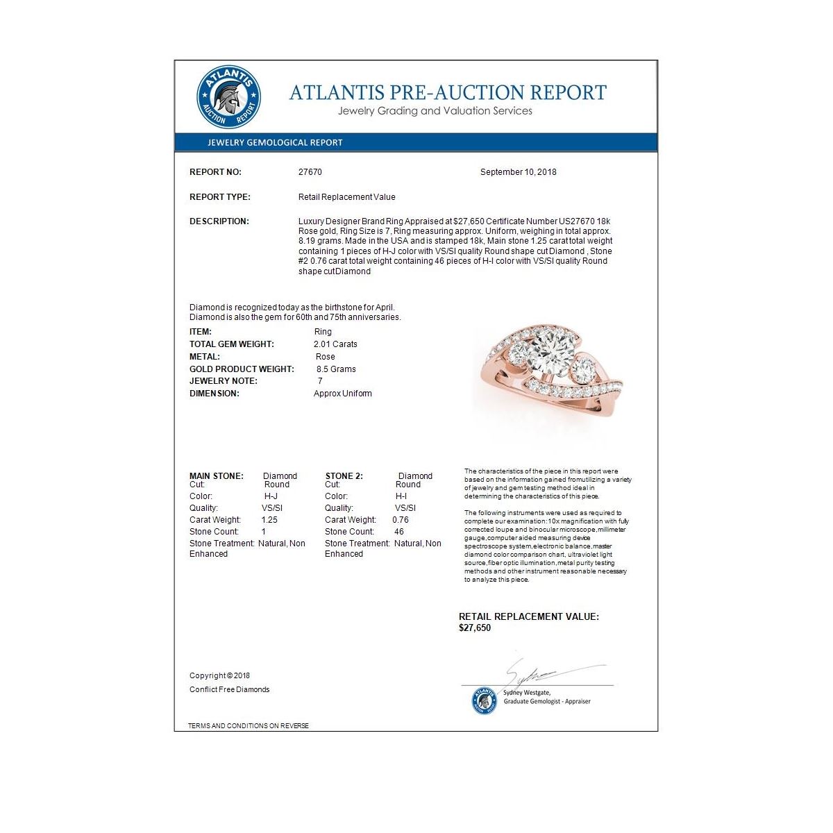 REF-558T5M -27670 ---- 2.01 CTW Certified VS/SI Diamond Bypass Solitaire Ring 18K Rose Gold ---- Luxury Designer Brand Ring Appraised at $27,650 Certificate Number US27670 18k Rose gold, Ring Size is 7, Ring measuring approx. Uniform, weighing in total approx. 8.19 grams. Made in the USA and is stamped 18k, Main stone 1.25 carat total weight containing 1 pieces of H-J color with VS/SI quality Round shape cut Diamond , Stone #2 0.76 carat total weight containing 46 pieces of H-I color with VS/SI quality Round shape cut Diamond