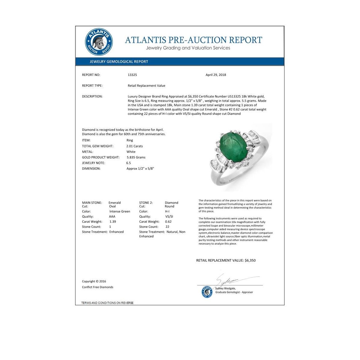 REF-96T4M -13325 ---- 2.01 CTW Emerald & Diamond Ring 18K White Gold ---- Luxury Designer Brand Ring Appraised at $6,350 Certificate Number US13325 18k White gold, Ring Size is 6.5, Ring measuring approx. 1/2" x 5/8" , weighing in total approx. 5.5 grams. Made in the USA and is stamped 18k, Main stone 1.39 carat total weight containing 1 pieces of Intense Green color with AAA quality Oval shape cut Emerald , Stone #2 0.62 carat total weight containing 22 pieces of H-I color with VS/SI quality Round shape cut Diamond