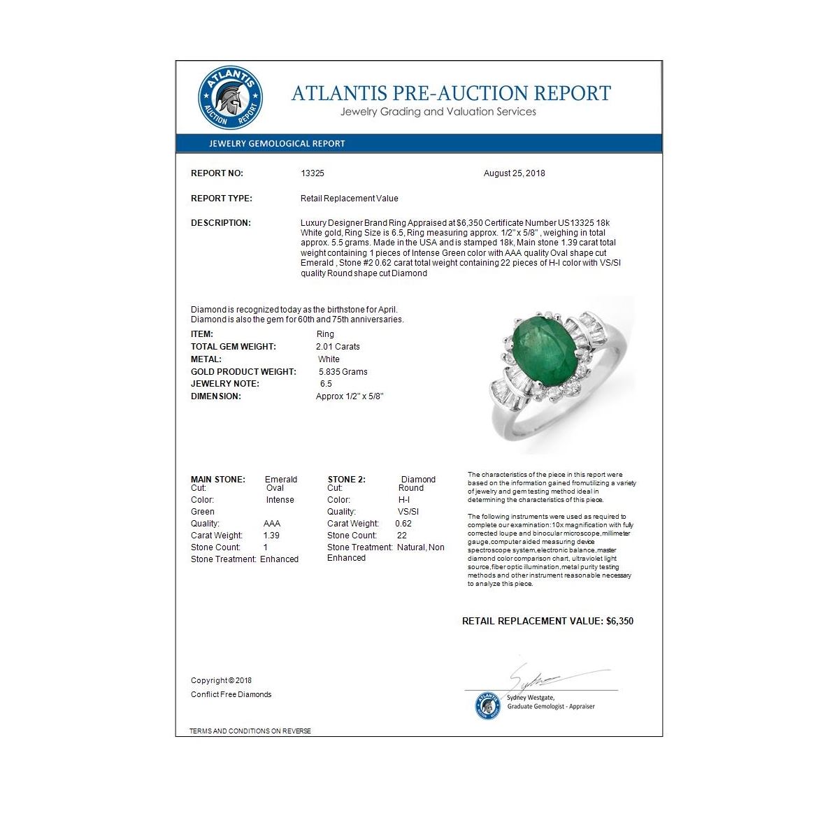 REF-96T4M -13325 ---- 2.01 CTW Emerald & Diamond Ring 18K White Gold ---- Luxury Designer Brand Ring Appraised at $6,350 Certificate Number US13325 18k White gold, Ring Size is 6.5, Ring measuring approx. 1/2" x 5/8" , weighing in total approx. 5.5 grams. Made in the USA and is stamped 18k, Main stone 1.39 carat total weight containing 1 pieces of Intense Green color with AAA quality Oval shape cut Emerald , Stone #2 0.62 carat total weight containing 22 pieces of H-I color with VS/SI quality Round shape cut Diamond