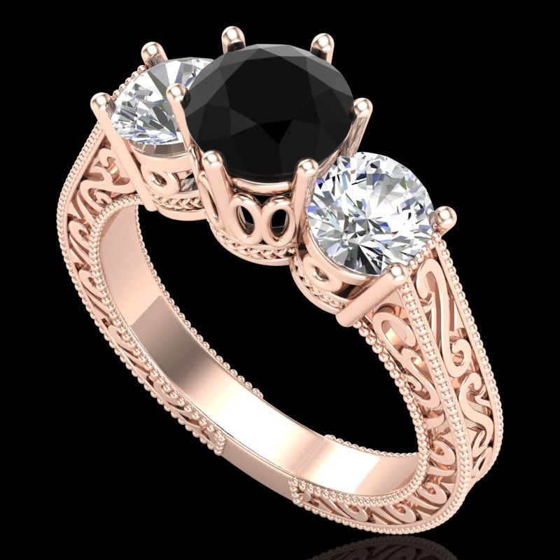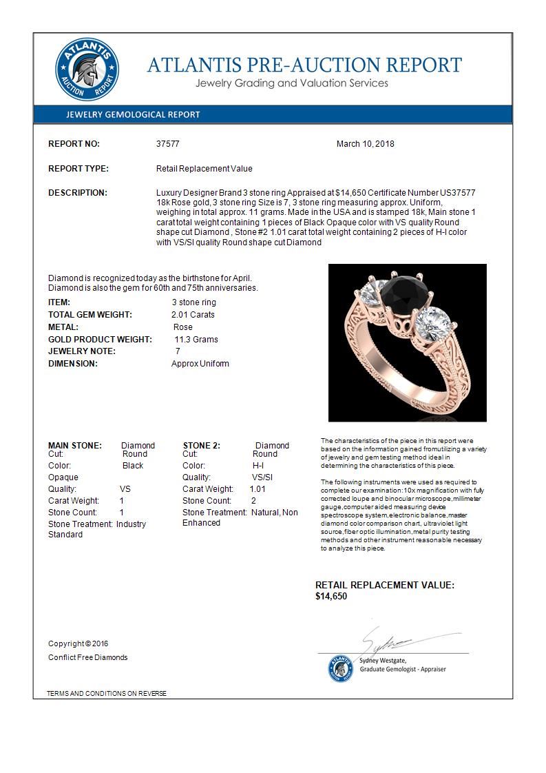 REF-241A8X -37577 ---- 2.01 CTW Fancy Black Diamond Solitaire Art Deco 3 Stone Ring 18K Rose Gold ---- Luxury Designer Brand 3 stone ring Appraised at $14,650 Certificate Number US37577 18k Rose gold, 3 stone ring Size is 7, 3 stone ring measuring approx. Uniform, weighing in total approx. 11 grams. Made in the USA and is stamped 18k, Main stone 1 carat total weight containing 1 pieces of Black Opaque color with VS quality Round shape cut Diamond , Stone #2 1.01 carat total weight containing 2 pieces of H-I color with VS/SI quality Round shape cut Diamond