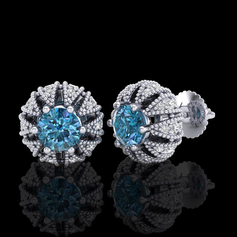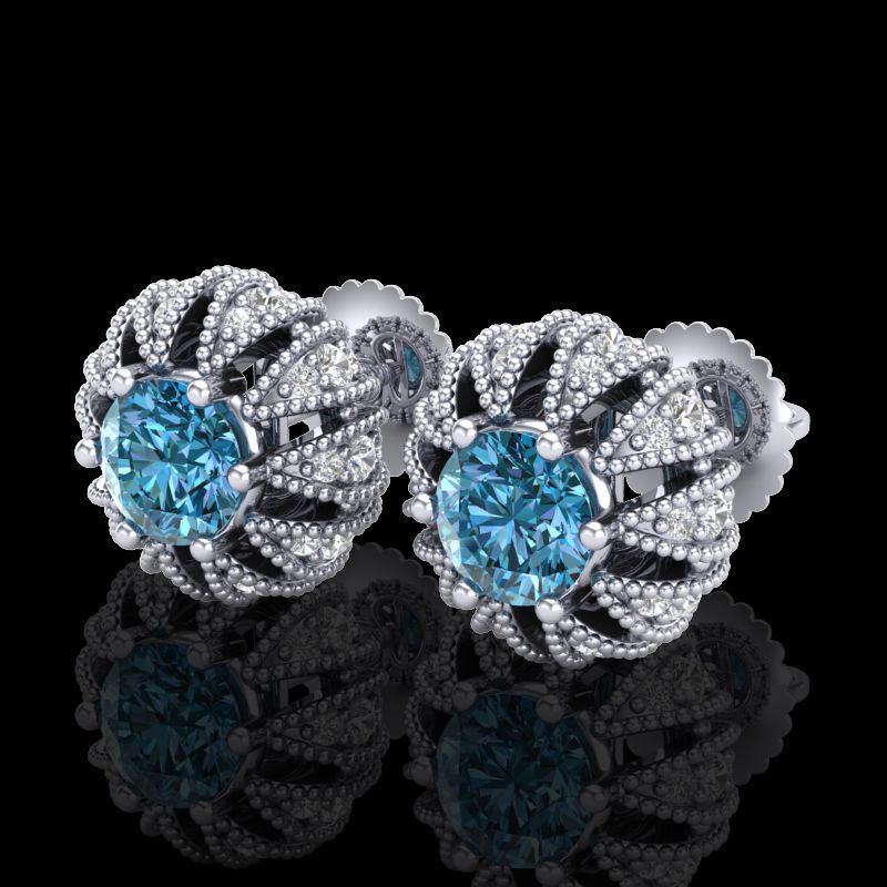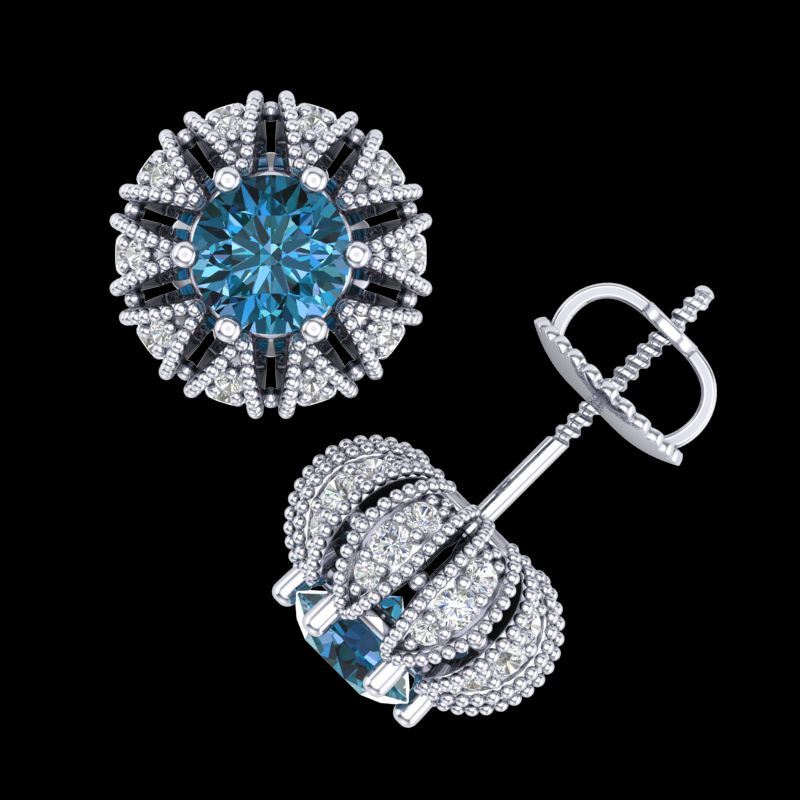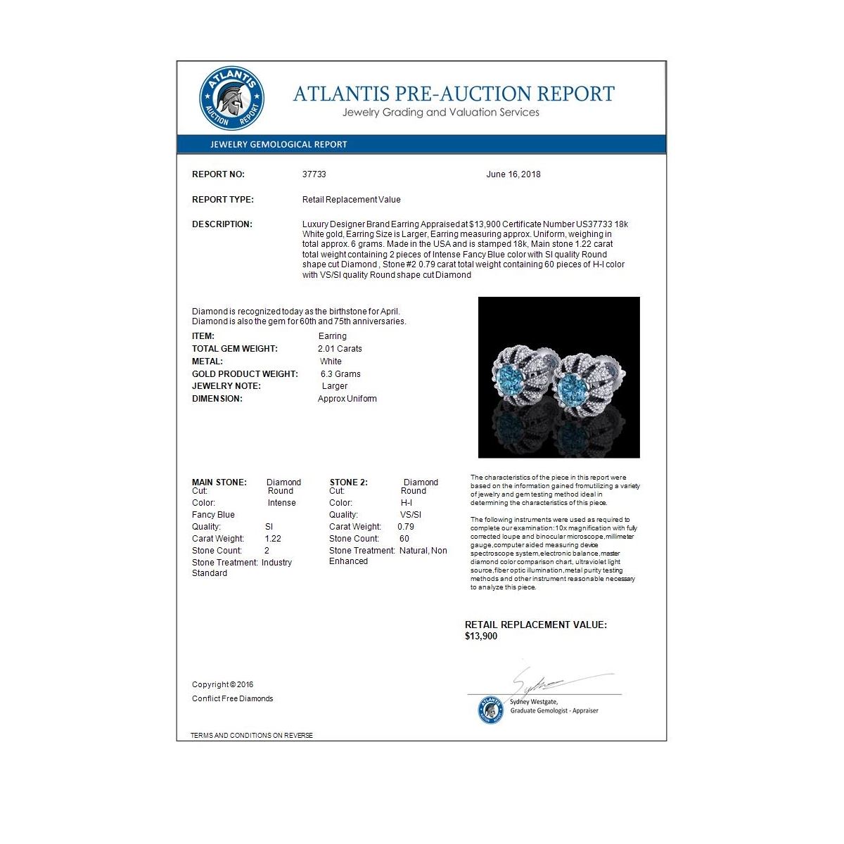 REF-210X9T -37733 ---- 2.01 CTW Fancy Intense Blue Diamond Art Deco Stud Earrings 18K White Gold ---- Luxury Designer Brand Earring Appraised at $13,900 Certificate Number US37733 18k White gold, Earring Size is Larger, Earring measuring approx. Uniform, weighing in total approx. 6 grams. Made in the USA and is stamped 18k, Main stone 1.22 carat total weight containing 2 pieces of Intense Fancy Blue color with SI quality Round shape cut Diamond , Stone #2 0.79 carat total weight containing 60 pieces of H-I color with VS/SI quality Round shape cut Diamond
