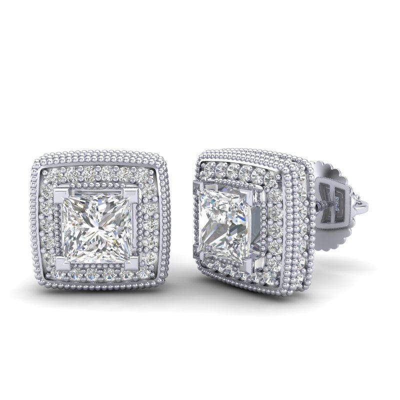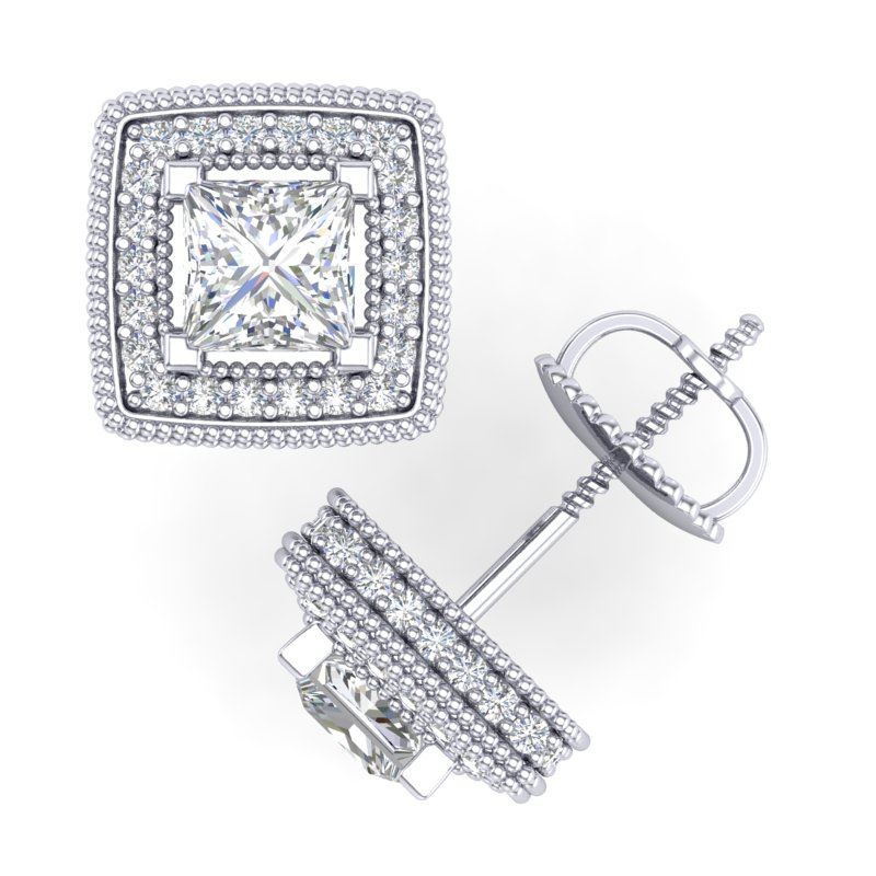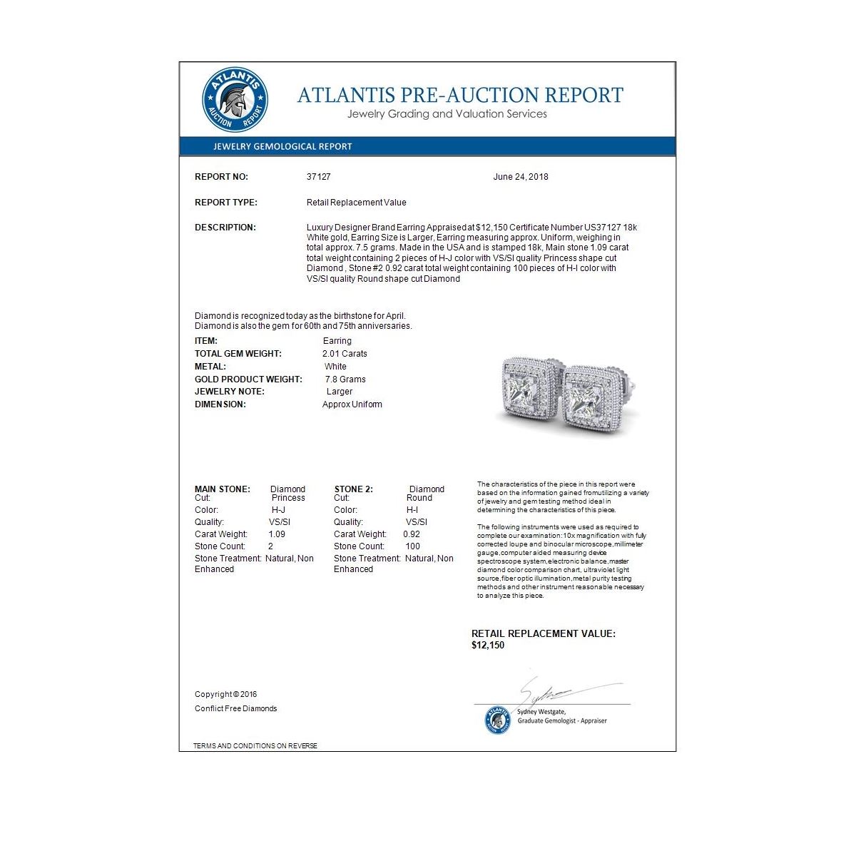 REF-245T5M -37127 ---- 2.01 CTW Princess VS/SI Diamond Solitaire Art Deco Earrings 18K White Gold ---- Luxury Designer Brand Earring Appraised at $12,150 Certificate Number US37127 18k White gold, Earring Size is Larger, Earring measuring approx. Uniform, weighing in total approx. 7.5 grams. Made in the USA and is stamped 18k, Main stone 1.09 carat total weight containing 2 pieces of H-J color with VS/SI quality Princess shape cut Diamond , Stone #2 0.92 carat total weight containing 100 pieces of H-I color with VS/SI quality Round shape cut Diamond